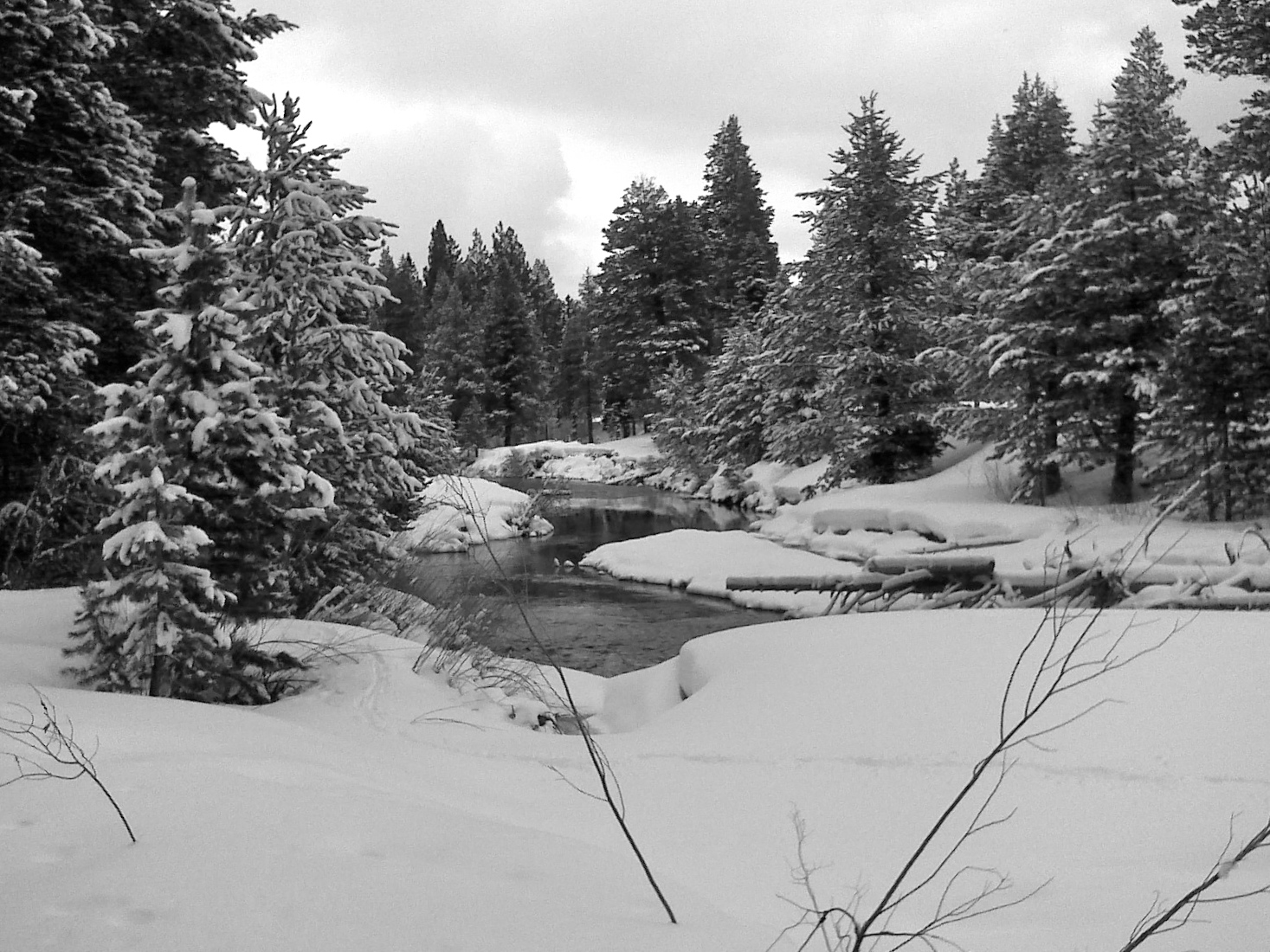 Ambled down the hill from the cabin we were staying in on a gorgeous winter’s day. Snowshoed down river a mile and a half or so.