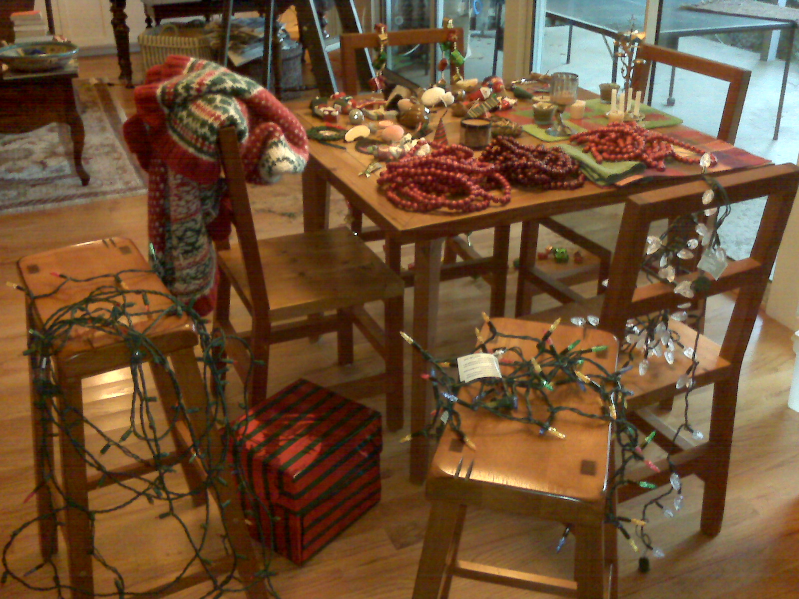 While packing things up, I did have this great urge to open all the doors and windows and let the cold, 40-degree air blow through the house, as if to clear it all out, freshen everything, thinking that by doing so, I’d rid the house of over-spent, expectation-laden, fattening, beaten-into-submission energy. So I did that too… until I got looked askance at.