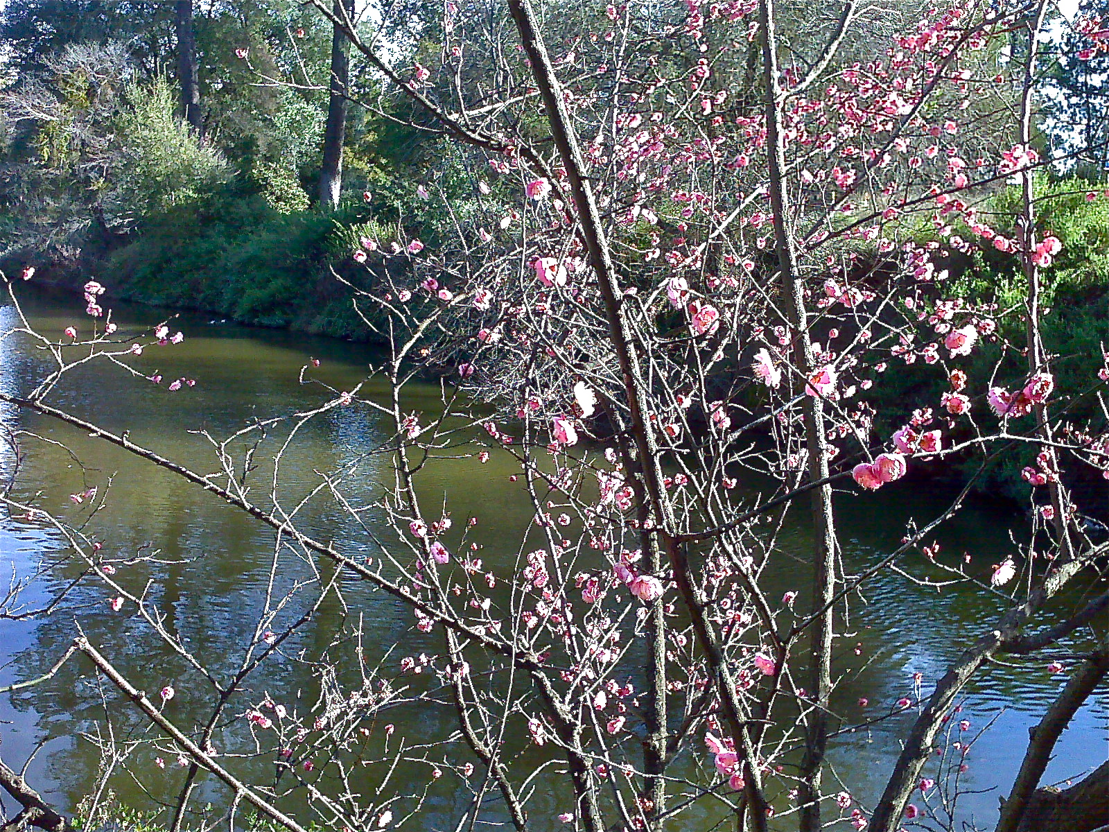 A few things to know about this picture: It’s shot through that curtain-of-water fountain over by the Mondavi Center. That’s I-80 in the background.. if you could make out cars on the horizon. The sky’s very spring-like and, at mid-morning, it’s about 66 degrees. Air warm and breezy. The trees don’t have leaves on them yet…but on this same walk, I took pictures of trees that are starting to bloom.
