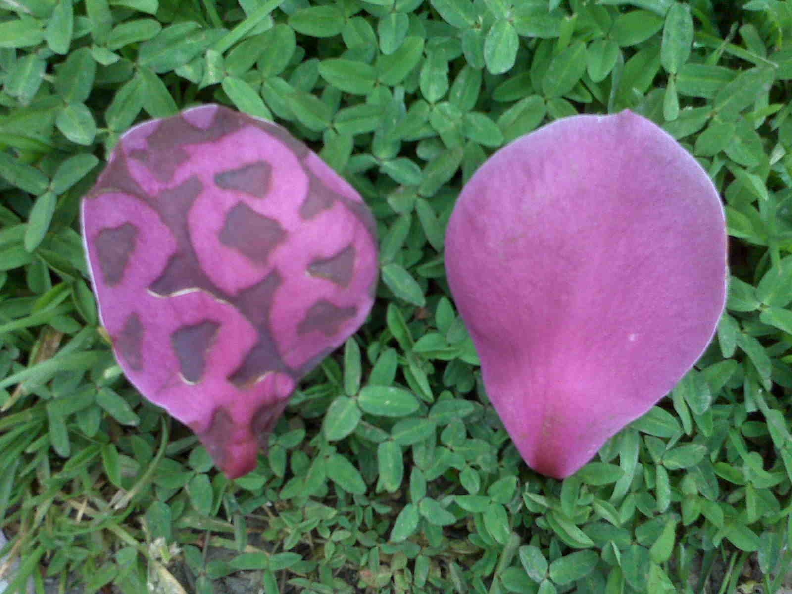 I and my walking buddy were mystified when we came upon this incredibly unique magnolia petal this morning (the one on the left). What an amazing specimen, we thought. We compared the quilted, bi-colored petal to others we found lying at the base of the tree (see above), and tried to figure out how on earth it came out like that. Kept us entertained for more than a few minutes. Mother Nature works in mysterious and beautiful ways, we concluded.