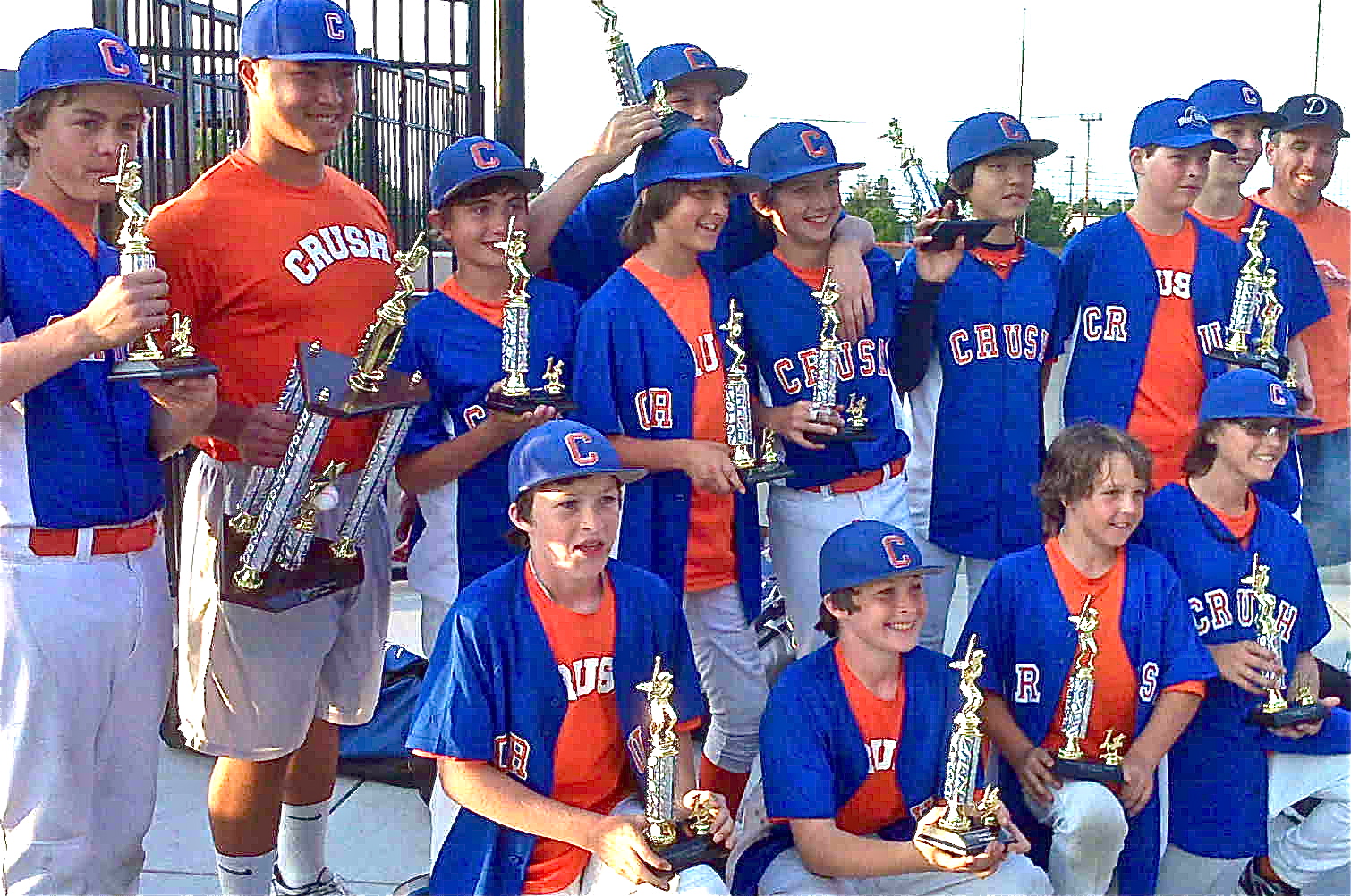 In their semi-final game, the Crush beat a team considered to be one of the best in the region, if not the state (maybe the world). In fact, that was the highlight of the tournament and it was a beautifully played game. In the second inning, Peter hit a weak grounder to second but beat out the throw with a stomach slide into first base. Not elegant, mighty unconventional, but it did the trick…he got on base and got Eric to third. That would set up that cute play they do where: the-runner-on-first-distracts-the-pitcher-by-attempting-to-steal-second-while-the-runner-on-third-scores. Which they executed perfectly. For the first run of the game. Yay us. (Of course a whole lot of other very spectacular playing occurred–some mind-blowing fielding, some artful, powerful pitching, a few eyebrow-raising hits… I just particularly liked that move. Plus, I’m the mom.)