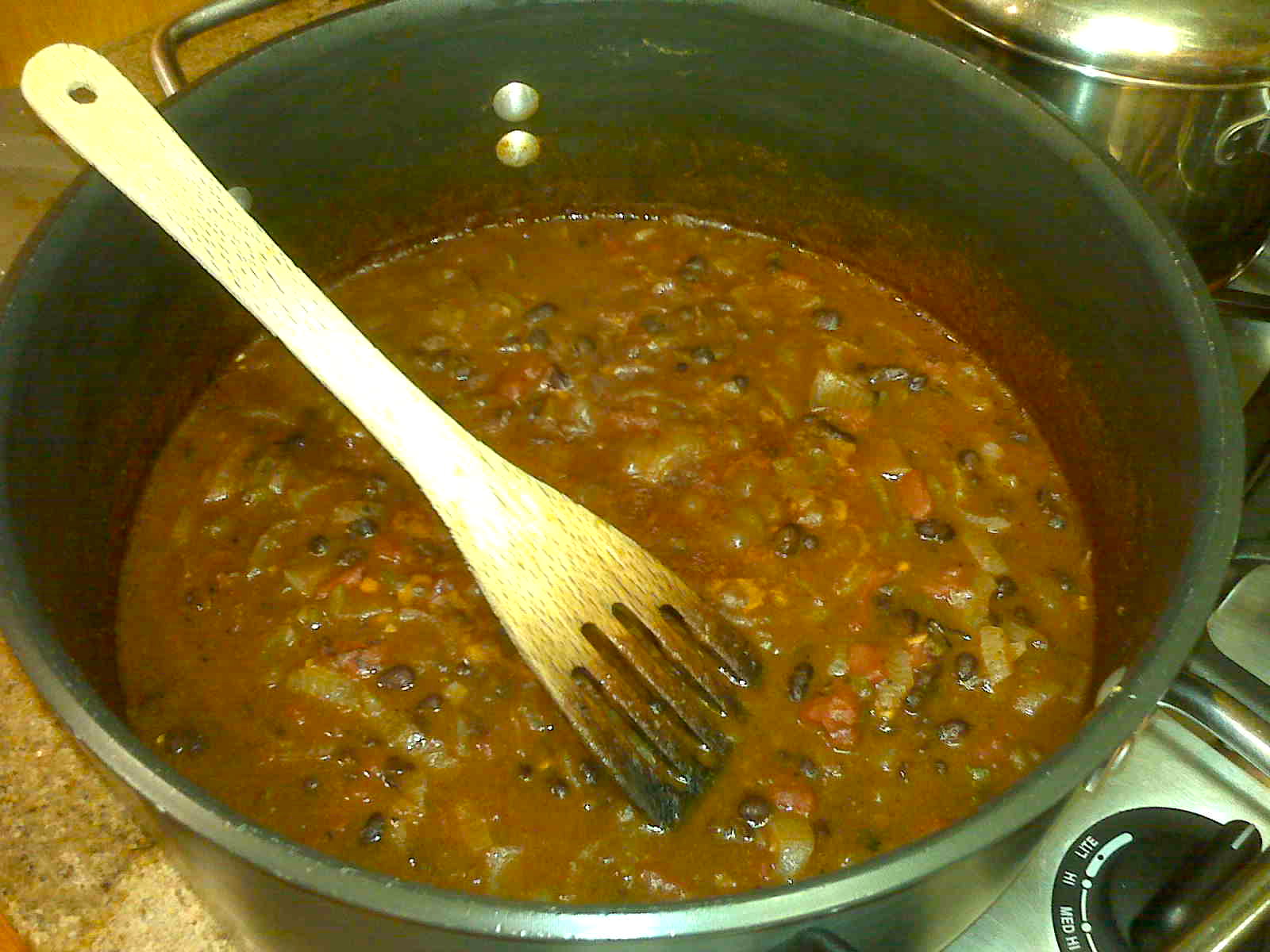 It was so chilly we decided not to barbeque. I mean really. So, instead of grilling stuff, we served the black beans we’d made a couple nights ago. Not the usual summer-kick-off weekend. Cloudy, unseasonably cold weather forecast for the rest of the week, and the possibility of more rain. Meh.