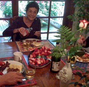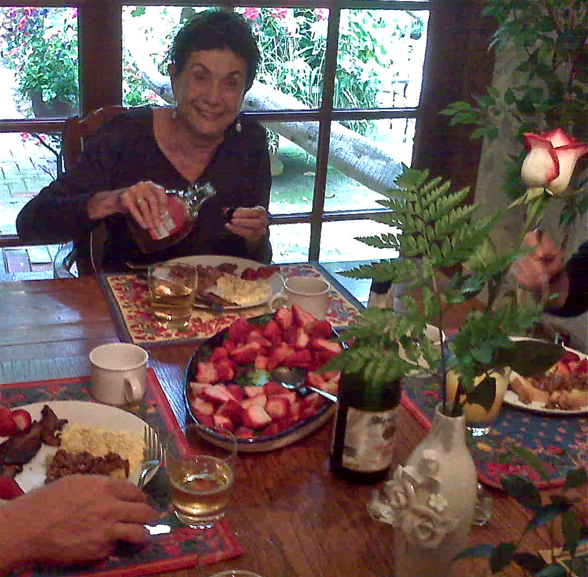 Here, at the head of the table, with syrup poised over Jim’s famous french toast, and flanked by her four kids, is mom–guest of honor for the second straight meal in a row. (Little bit of a bummer, if you’re a mom, to have your birthday and Mother’s Day so close together.) For this celebration she shared guest of honor honors with me, at the other head of the table, half flanked by my own offspring. (It is not a bummer, I’m told, to share Mother’s Day with your daughter, who is also celebrating Mother’s Day.)