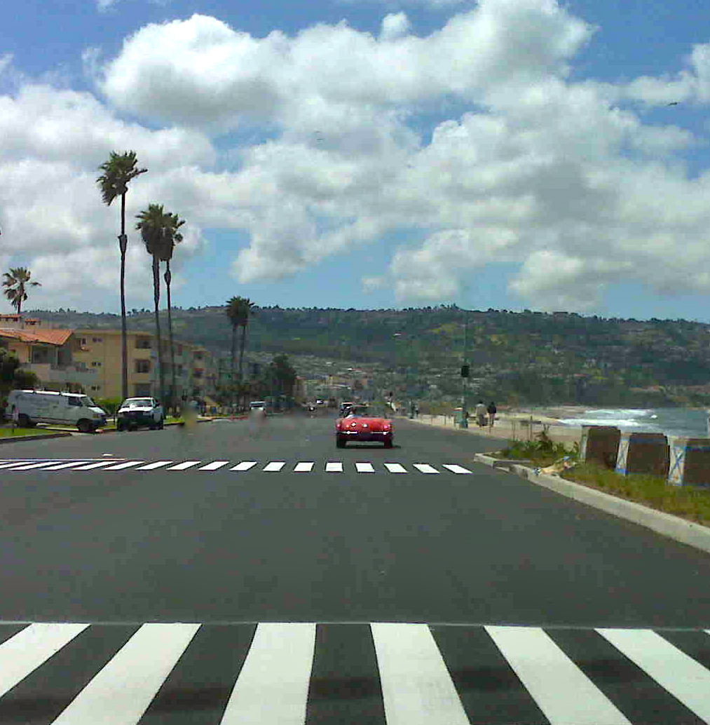 From the Esplanade, looking south, is my favorite view of the peninsula. I’m partial to this side of Palos Verdes–Malaga Cove, the Plaza, the PV Pool, the Neighborhood Church, the dense eucalyptus, the red tile roofs, and Rat Beach–cuz, obviously, I grew up there. Looking at the hill, you can’t see the houses in our neighborhood (for the trees), but you can see where our house is (a wee bit above the red convertible, below).
