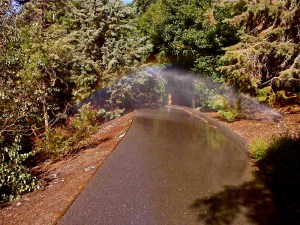 Summer walks along Putah Creek are the greatest, really….  very warm this particular early morning, the sprinklers were on and they were insanely refreshing to walk through.  And then all the flippin’ rainbows.  I swear..