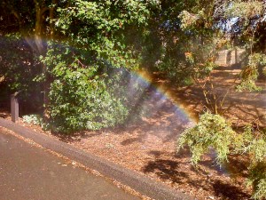 Rainbows are a little hard to capture with my not-so-mighty cell phone camera, but perhaps you can make out some of the color that bombarded us from all sides on our walk this morning.
