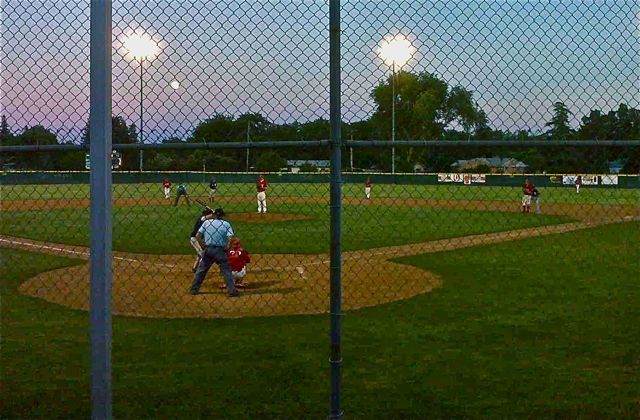 Anyway. Baseball? Of course. And ESPECIALLY baseball last night: a hot summer evening with a full moon rising. Bruce Gallaudet told me they (the City of Woodland?) had spent the last year rebuilding Clark Field (on Beamer Street). The result is a PERFECT and lush carpet of bright green grass, and dirt that is smooth, rich and dark around the base paths. If you love the look of a sharply cut baseball field against a midnight blue sky with a giant globe hanging behind left-center, this was your night to be watching baseball.