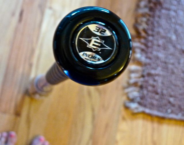 It’s an Easton Stealth Speed 2010, a composite bat that boasts integrated matrix technology with a carbon nano tube somethingerother for faster swing speed and lower swing weight. It has a blue handle, measures 32 inches in length and weighs 22 ounces.