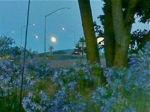 Here’s a shot from the drive through lane, over the agapanthas. The moon looks a little misshapen here, but I like the way the blues and greens come together.