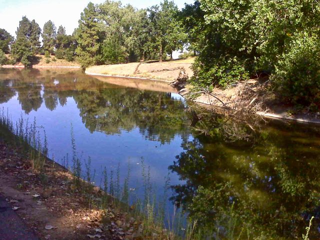 Turns out pond scum skimming is a pretty effective technique for cleaning the surface of Putah Creek. Here’s a shot of the same spot today, same time of day… no scum at all.