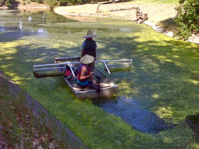And here come these guys in a slow moving boat, wearing broad brimmed hats, skimming slimy green gunk off the surface of the water as they navigate carefully upstream.