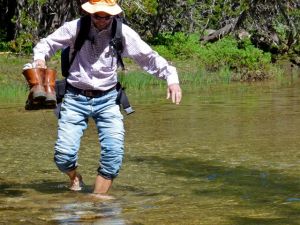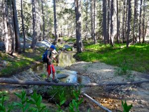 Started at the Sunrise parking lot. Within a hundred yards of the trailhead, we had to remove our boots and ford a shallow creek. Made for a slow beginning on the day, but it was fine and something to look forward to at the end of the day when we’d certainly be dragging and cold water would feel good on tired dogs.