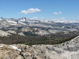 And here’s one looking south and east, over Long Meadow. Hard for me to identify all the peaks (any of them, really), but we’re probably seeing Mt. Lyell somewhere in there (highest peak in Yosemite National Park, 13,114′), who knows what else. Sunrise High Sierra camp is to the far right.