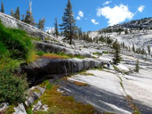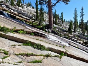 We left, picked our way down, this time much easier following the drainage to the bottom.. took a couple hours, I think, mostly on open granite like this (note water, which was gushing down the slabs all over the place, very powerful in parts, always glistening, and loud):
