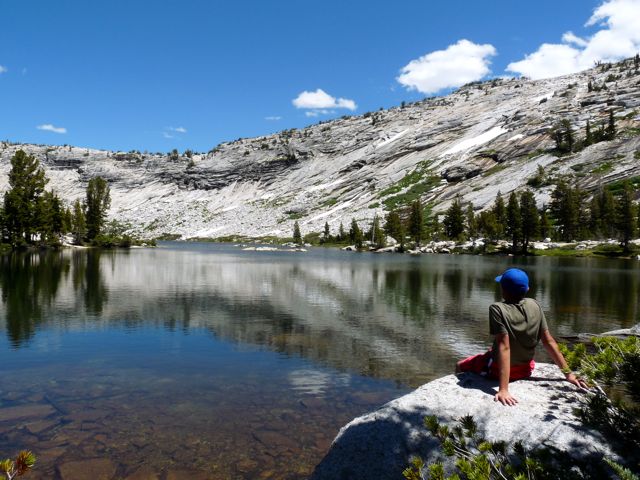 Finally got to Mildred Lake. So pretty, so central, yet there is no trail up there. We–as usual when hiking off trail–saw nobody all day (except at top of Tenaya later that afternoon).