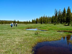 After about a mile and a half, you get out of the forest and off the first slope. Another mile or so on a gentle slope brings you to Elisabeth Lake, which we completely bypassed, instead continuing west, mostly, and up. It was very, very pretty.