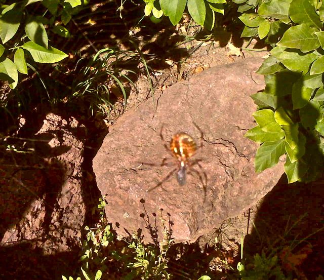 …however, to appreciate it, you have to use a little imagination: 1) she IS sitting in the center of a very well-designed, intact web; 2) she IS eating a bug; 3) she’s only about three and a half inches from my Blackberry (which is why she looks so humongous and like she could single handedly eliminate the entire population of downtown Manhattan); 4) that rock in the background is about two feet in diameter and is about four feet away.. just for perspective.