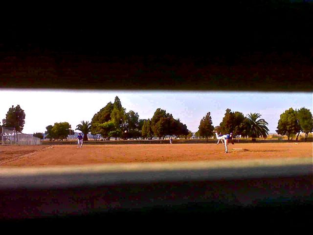 Round about game three (yes, three games today, two yesterday, for a full weekend of baseball), standing at all was getting difficult..  my back was starting to ache in that way that makes you think we were never meant to be bipedal.. and after awhile, I was crouching down and watching the game from between slits in the backstop.   This was that view.