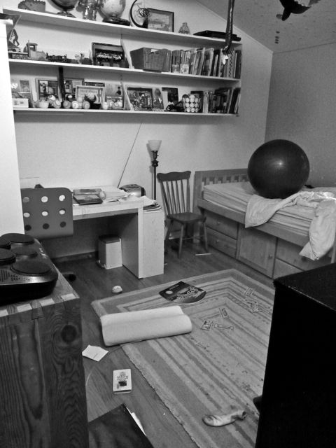 Really, you just can’t appreciate the mess in this picture, as so much of it is off camera. But trust me, it’s a disaster. And much of it is manmade, as in, “I’m so mad at you, Mom, I’m going to drive you batshit crazy by throwing this exercise ball against the wall 24,837 times and if it knocks over stuff on the shelves, well that’s just too damn bad, because I’m bored and you shouldn’t have taken away my media for the weekend, the LONG THREE DAY weekend, and I know how you hate it when my room’s all messy and stuff, so I’m going to throw some books around and empty my backpack and upend my laundry basket and scatter some money and unmake my bed and whatever else I can think of to make you regret ever following through with these so-called consequences.”