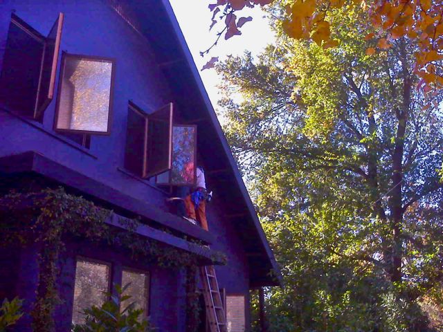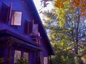 Funny day to be twenty feet above the ground, one foot stabilizing your tippy, tall ladder while washing windows — 50 mph winds, swirls and eddies of leaves and dust. Don’t think I’d want my windows open, but that’s me. Can’t beat this color. though.