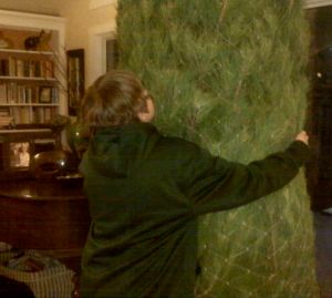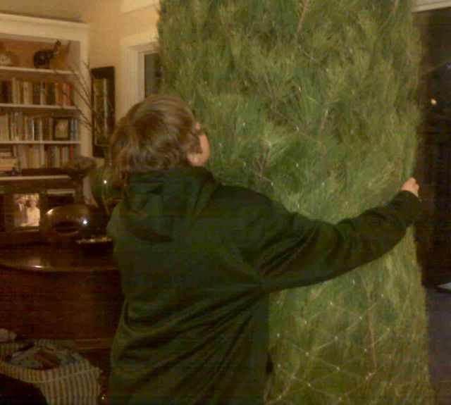Peter (tree hugger, pictured) is keeping it from falling, while Jim (tree wrangler, unpictured) is on his back on the floor awkwardly guiding the trunk into the stand and adjusting the fittings.
