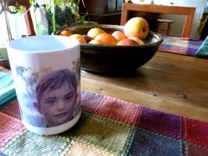 Went in search of paper towels this morning, and ended up emptying two over-filled, treasure-rich kitchen cabinets. Among other things, found this mug from about six years ago. Definitely one of the benefits of a spontaneous, unplanned cabinet purging and reorganization project!