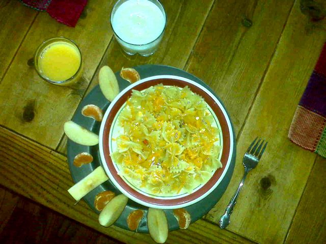 This is an all white/orange lunch: apple & mandarins, pasta w/ cheddar cheese, milk and oj.