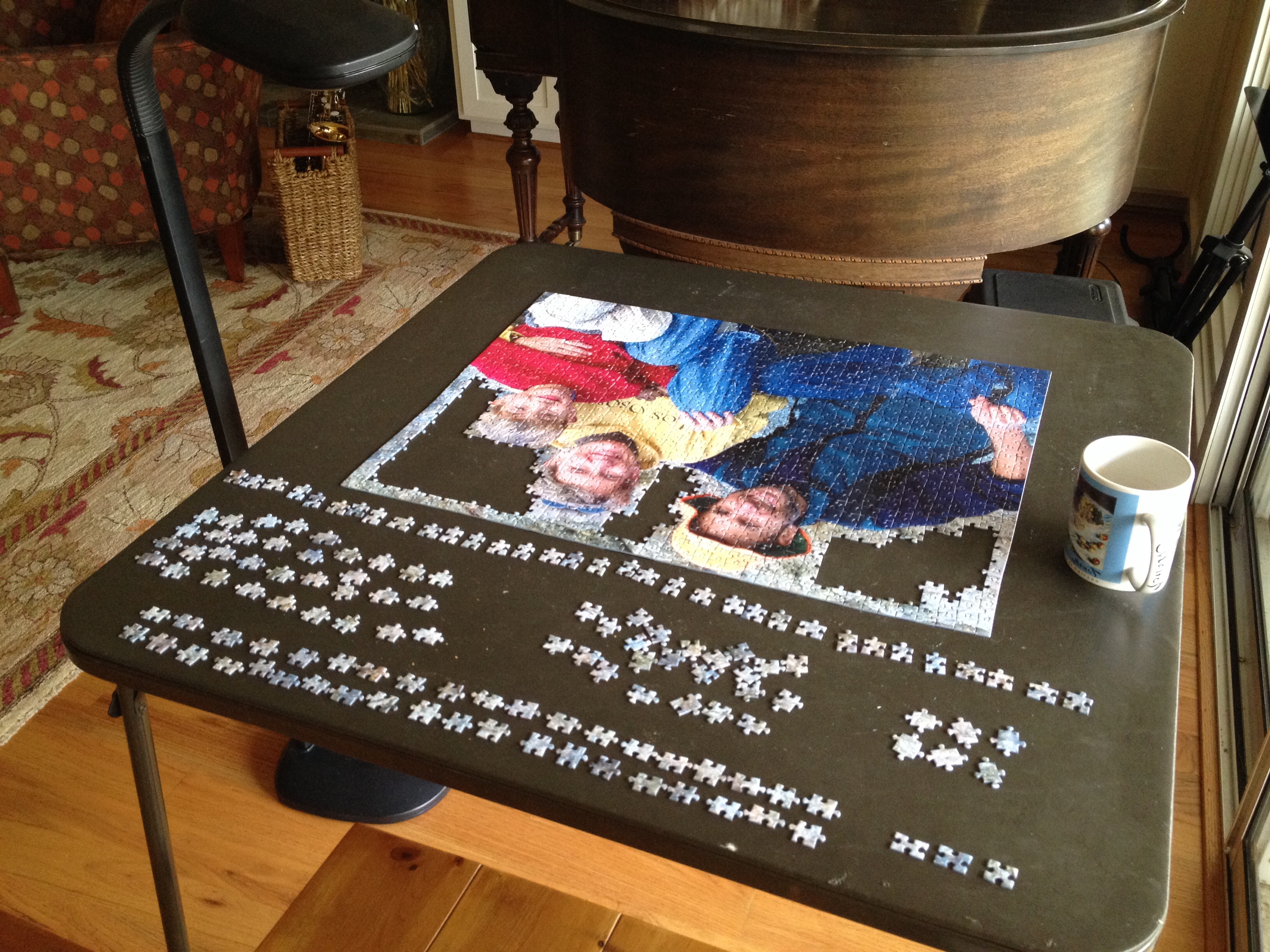 I’ve entered that phase of the jigsaw puzzle where I’ve placed every piece that has anything on it of any note — color or design — and now it’s just a tedious slog to the finish.  All that’s left is granite, and all the granite is alike. Ugh. So, I’m to the point where I’ve sorted pieces by shapes and will finish it off by summoning my best spacial relations skills.  I estimate about 100-150 pieces remain… each takes about 1-5 minutes to find… though things will go way faster as the number of remaining pieces diminishes.