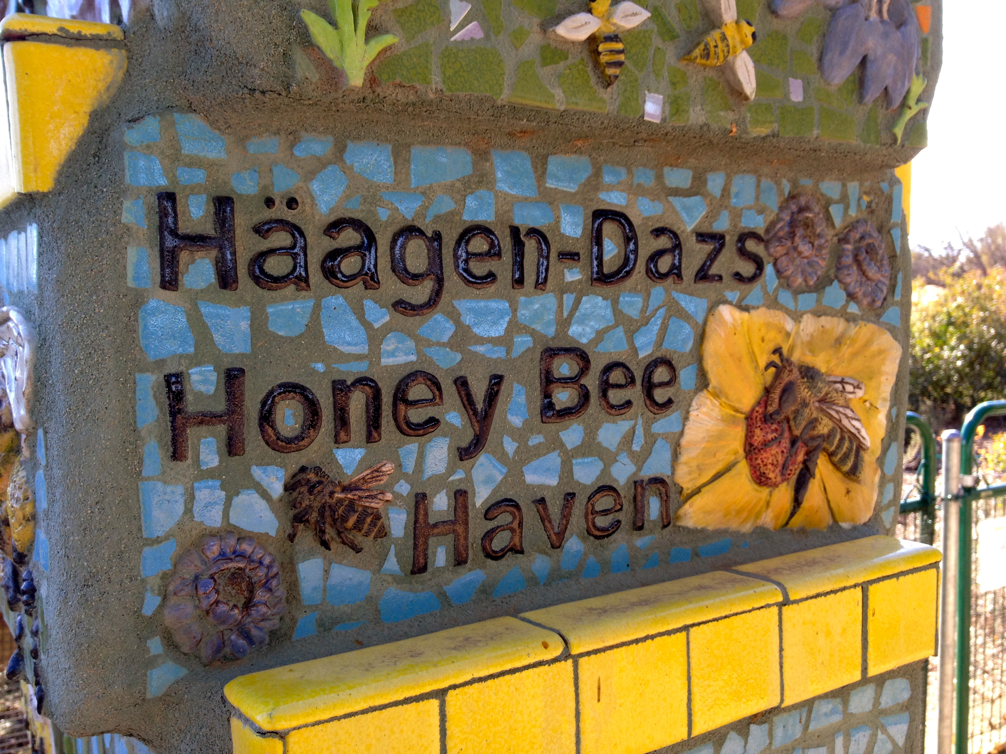 I visited, for the first time, The Haagen Dazs Honey Bee Haven, on the far west side of campus. The Bee Haven, which opened in the fall of 2010, “is a series of gardens designed to provide a year-round source of food for bees and a lasting source of inspiration for the public.” It has about 25 plaques which describe honey making and other bee facts; lots of different kinds of plants, shrubs and trees, all labeled; and lots of ceramic tile art work. It’s nice.