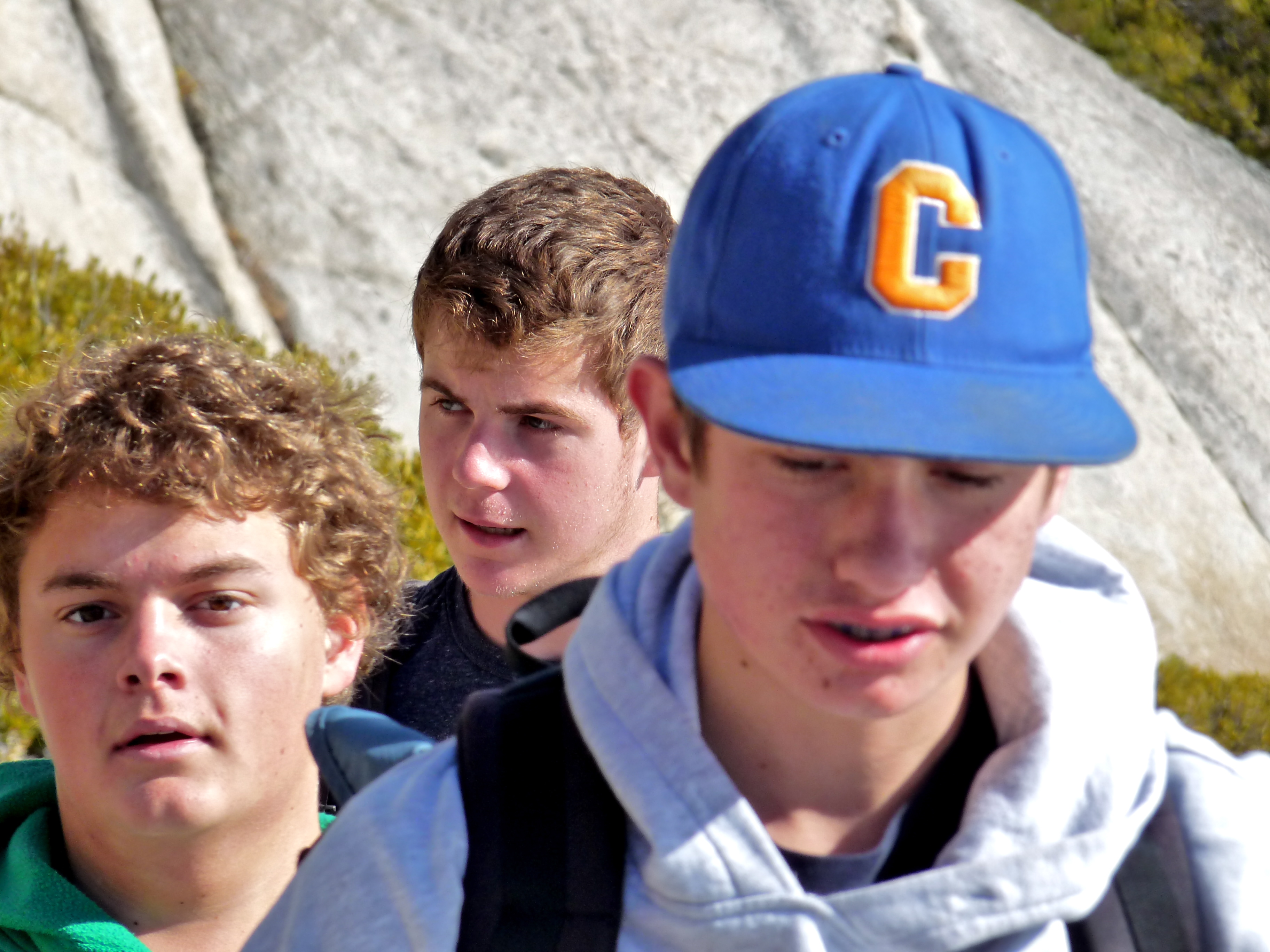 It was going to be a fairly doable, if challenging, off-trail hill climb with a stretch of class III scrambling near the top, and potentially some exposure. From the lake (7414′) to the top of Flagpole would be about a 950′ climb in a very short distance. The boys were all up for it. After about 3/4 mile, everyone pulled off the PCT and Marc asked the boys to visually pick out a route. After some discussion, and gentle guidance from Marc, they agreed on a plan and took off.