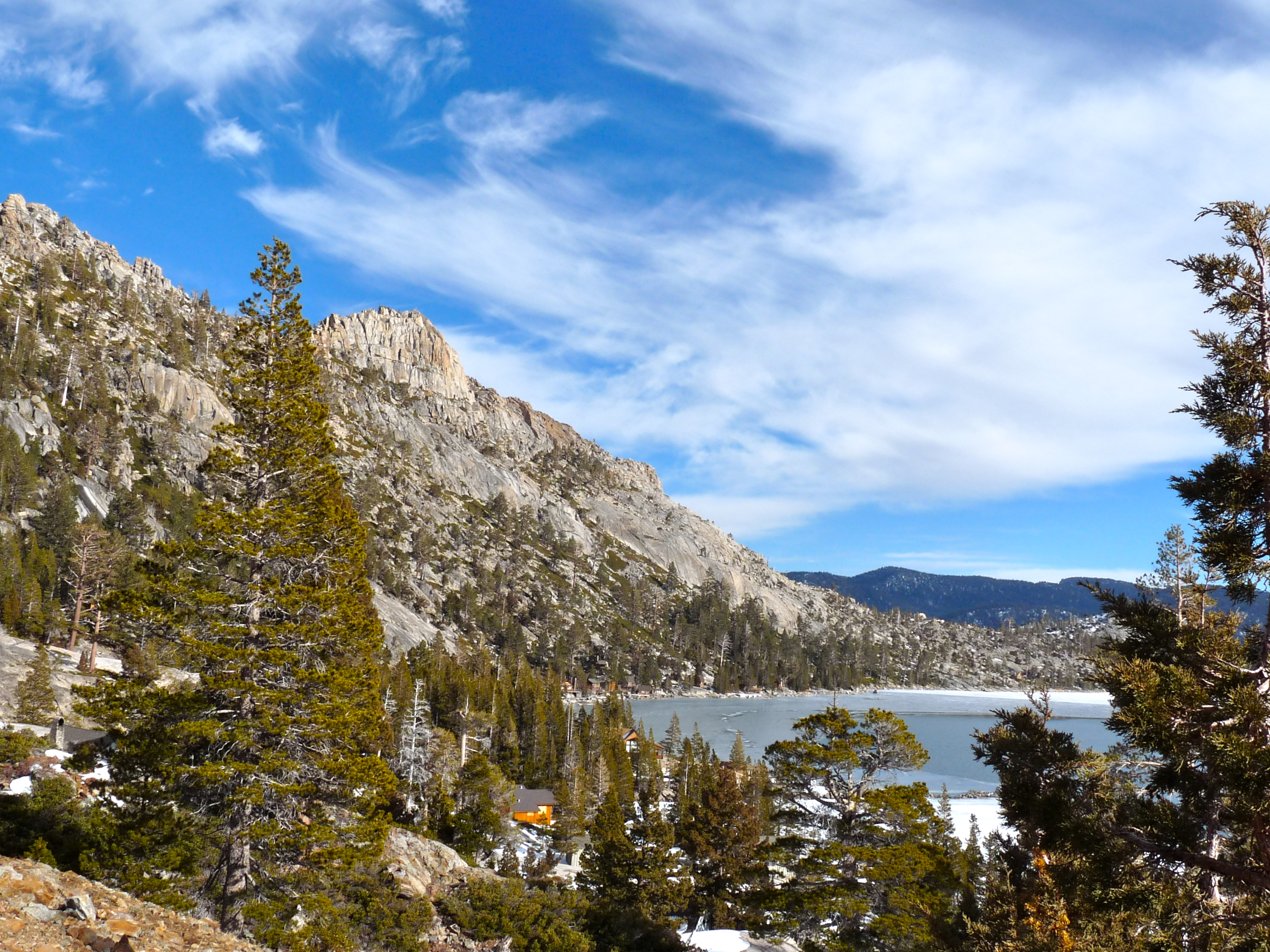 Carrie, Bodie and I opted for a mellower hike along the lake. Carrie was dealing with an injury and needed to go back, so I decided I’d really like to hike up to the upper lake to see what it looked like in the winter and especially to see what the Ricker cabin looks like surrounded by snow. So I did that. It became my birthday present to me, a bit of winter, Sierra solitude, a fast hike–all of which felt so, so good–and some amazing views. I just could not have been happier. Here’s a shot of Lower Echo from one of our traditional photo op spots: