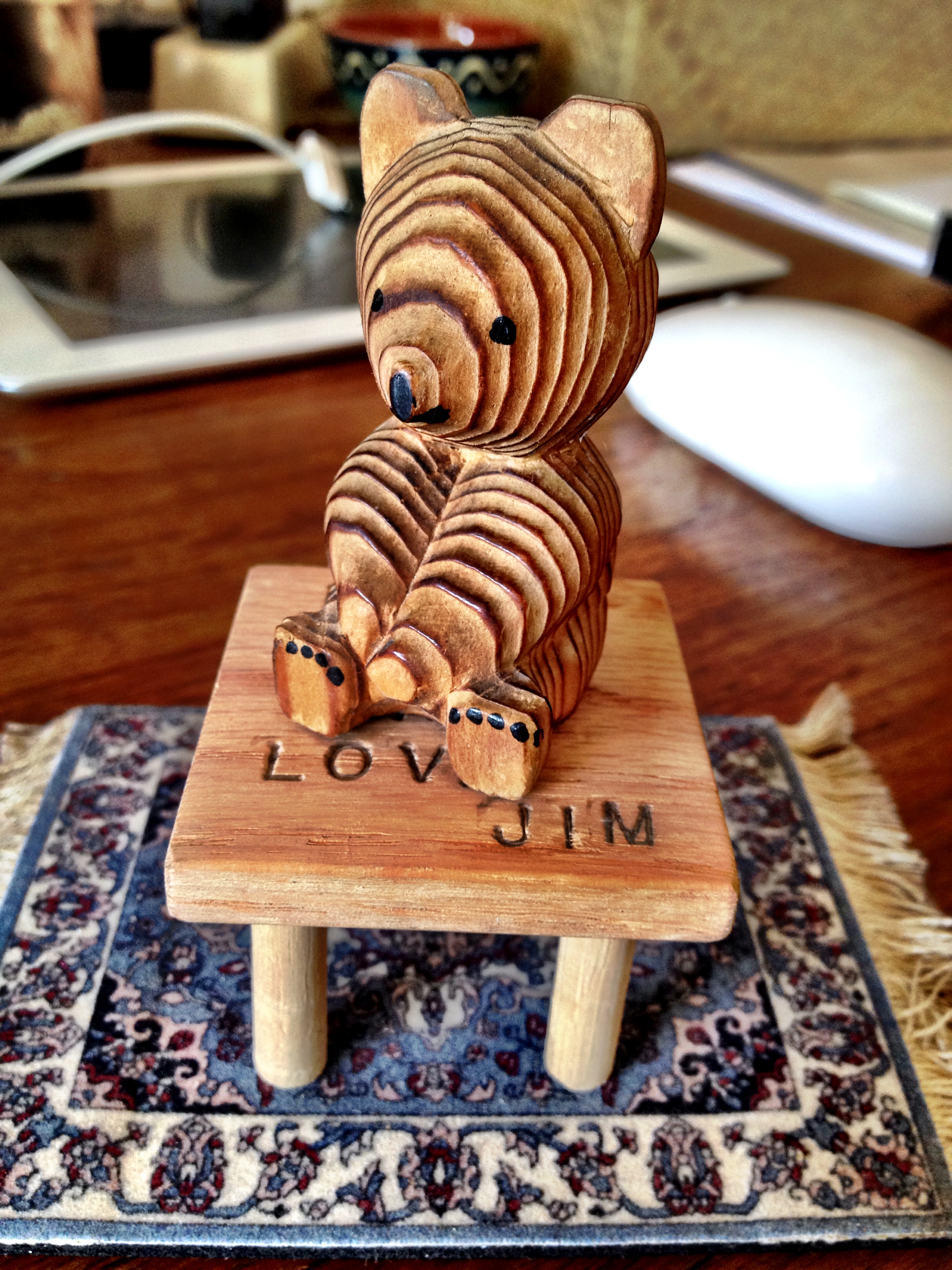 I also remembered that one of my sweetest and most favorite possessions is this tiny (2.5″) wooden bear. My grandpa bought it for me at the Wawona Lodge in Yosemite after we’d spent an afternoon together–one of many during the years we spent in the Sierra–walking around looking at trees.