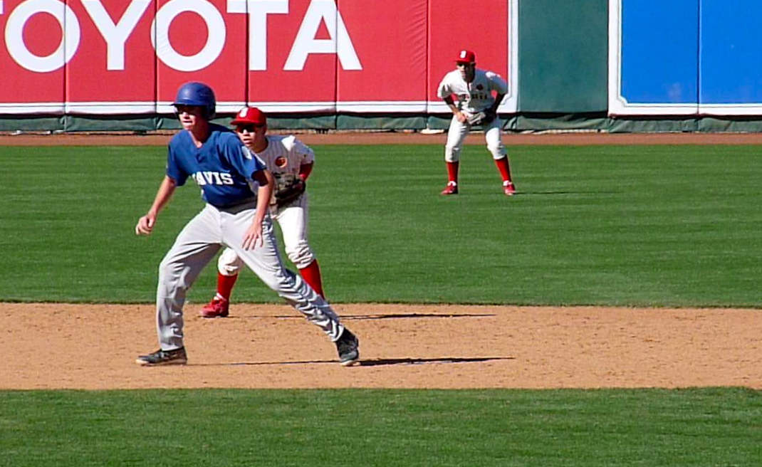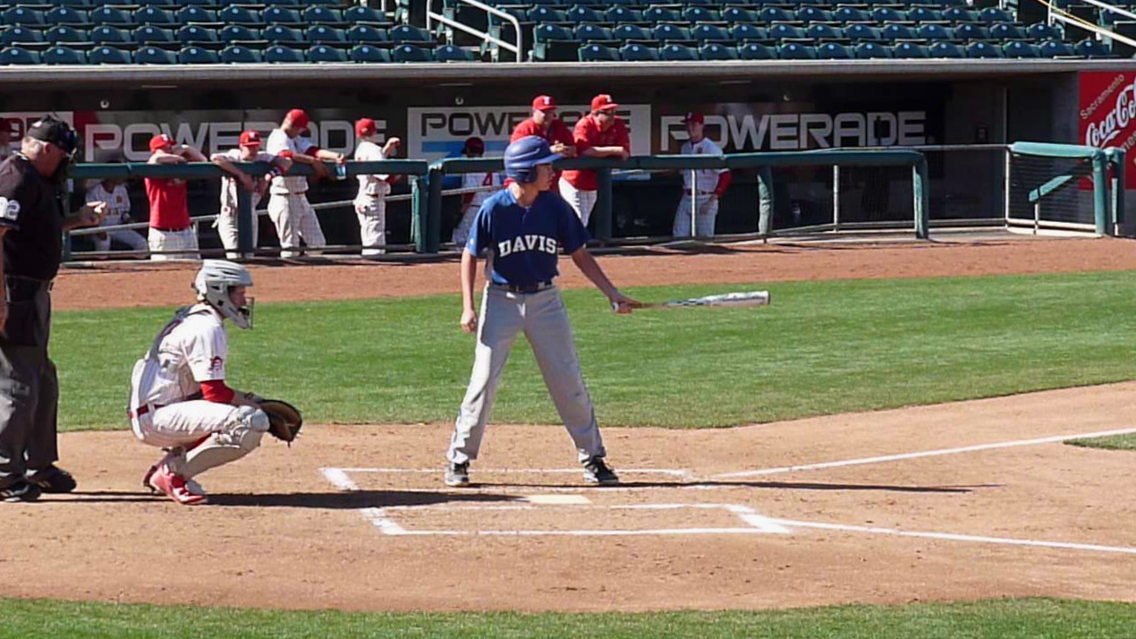 Today was the big Raley Field game. Annual event. It’s a big deal for the Davis High baseball guys who get to play on a AAA field maintained just like a major league ball field (which it is). The grass is lush and carefully manicured, the infield surface is flawless, the dugouts are huge and beautifully equipped. It doesn’t come cheap–each family has to pony up $200, but it comes in the form of vouchers for Rivercats games, so it’s a win-win. DHS traditionally square off against Jesuit, a private school in Sac that always has a top flight team.