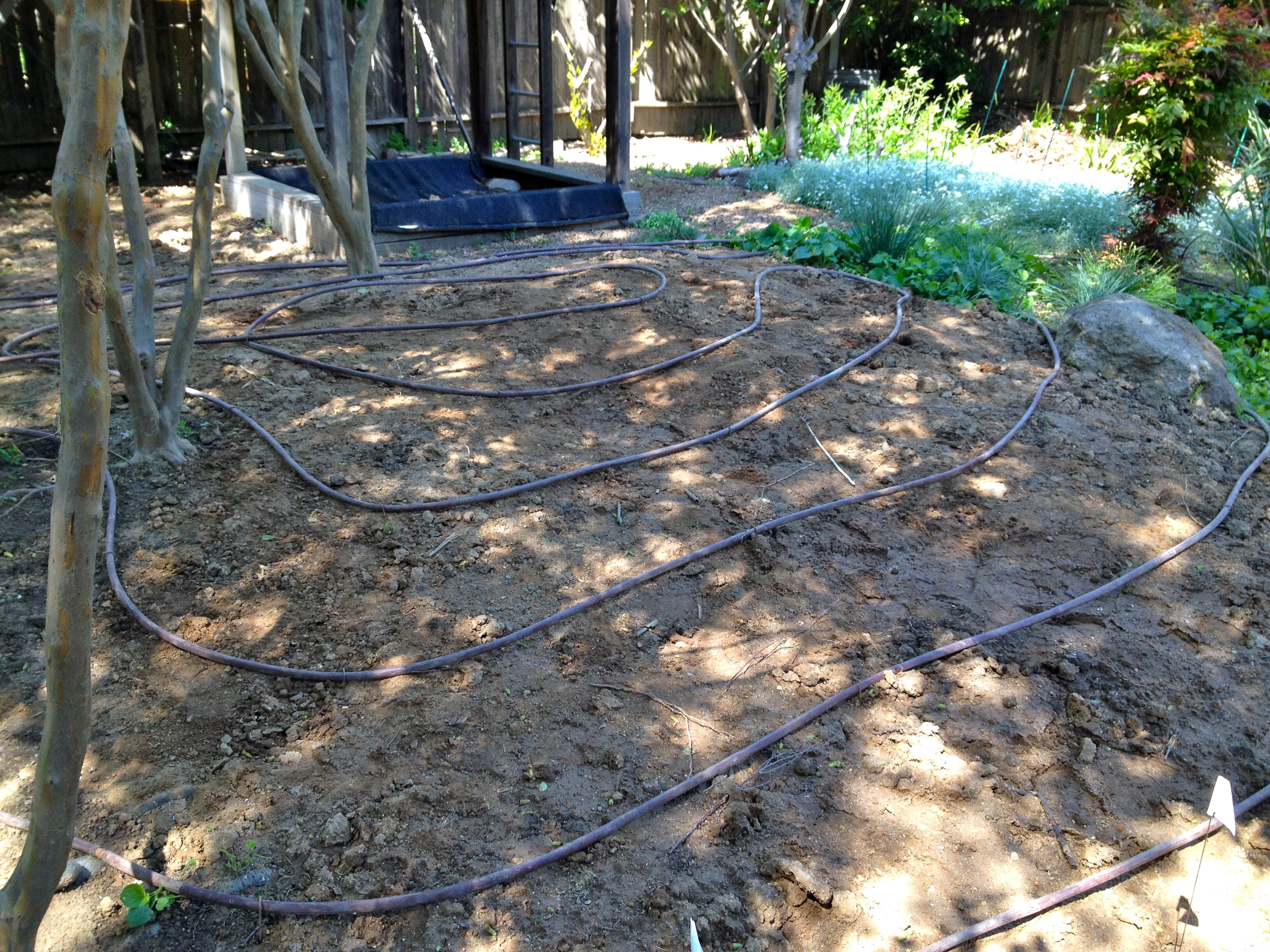 It sat there like that through a couple more major rain storms, and today, a week and a half later, we were able to press on. First step, re-lay the irrigation: