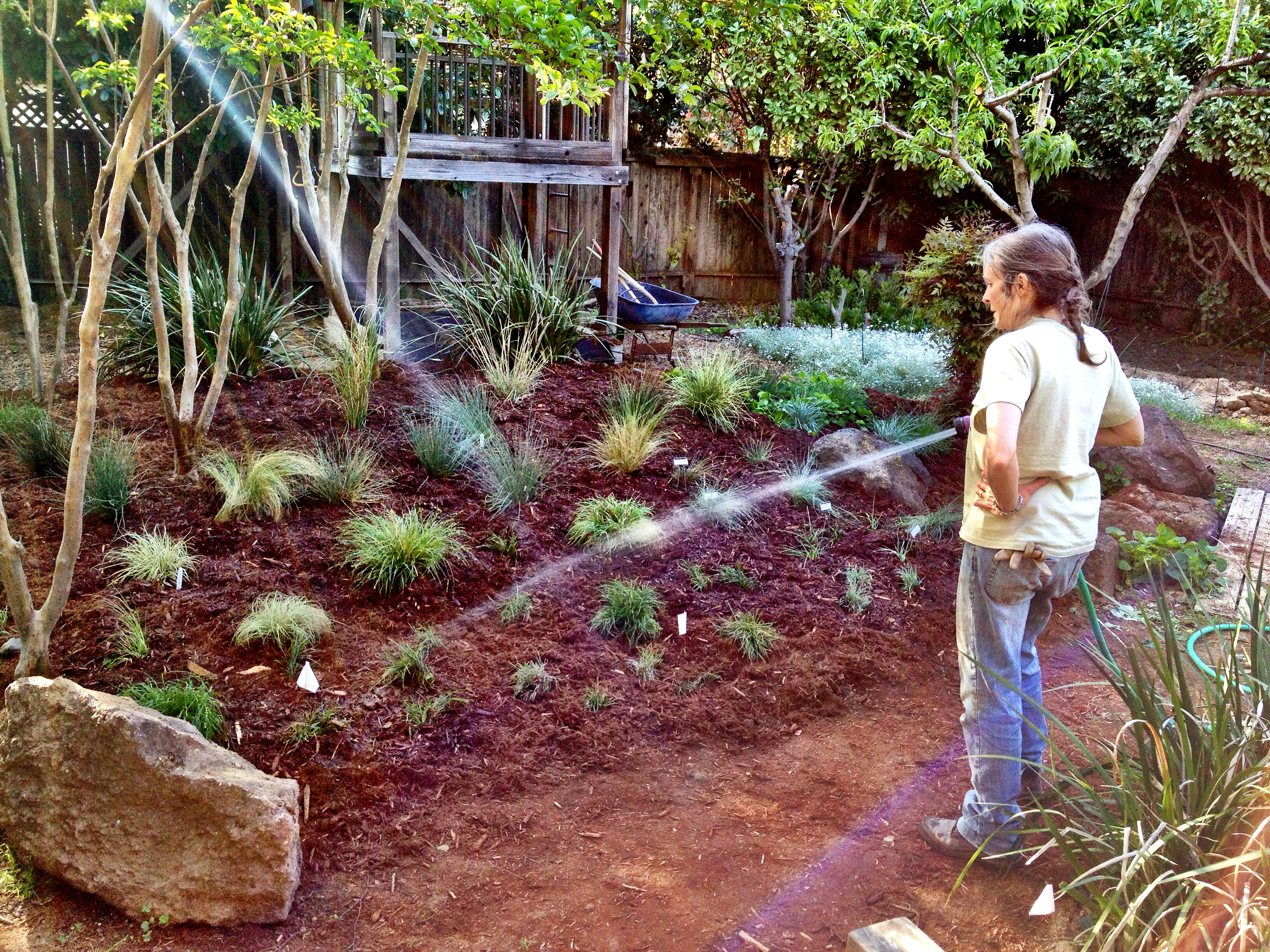 Then re-planted 50+ grasses (that’d been removed so the plumbers could get access to the sewer line, and gathered into a sad huddle along the north side of the yard for 5+ weeks) and, finally, scattered the mulch.