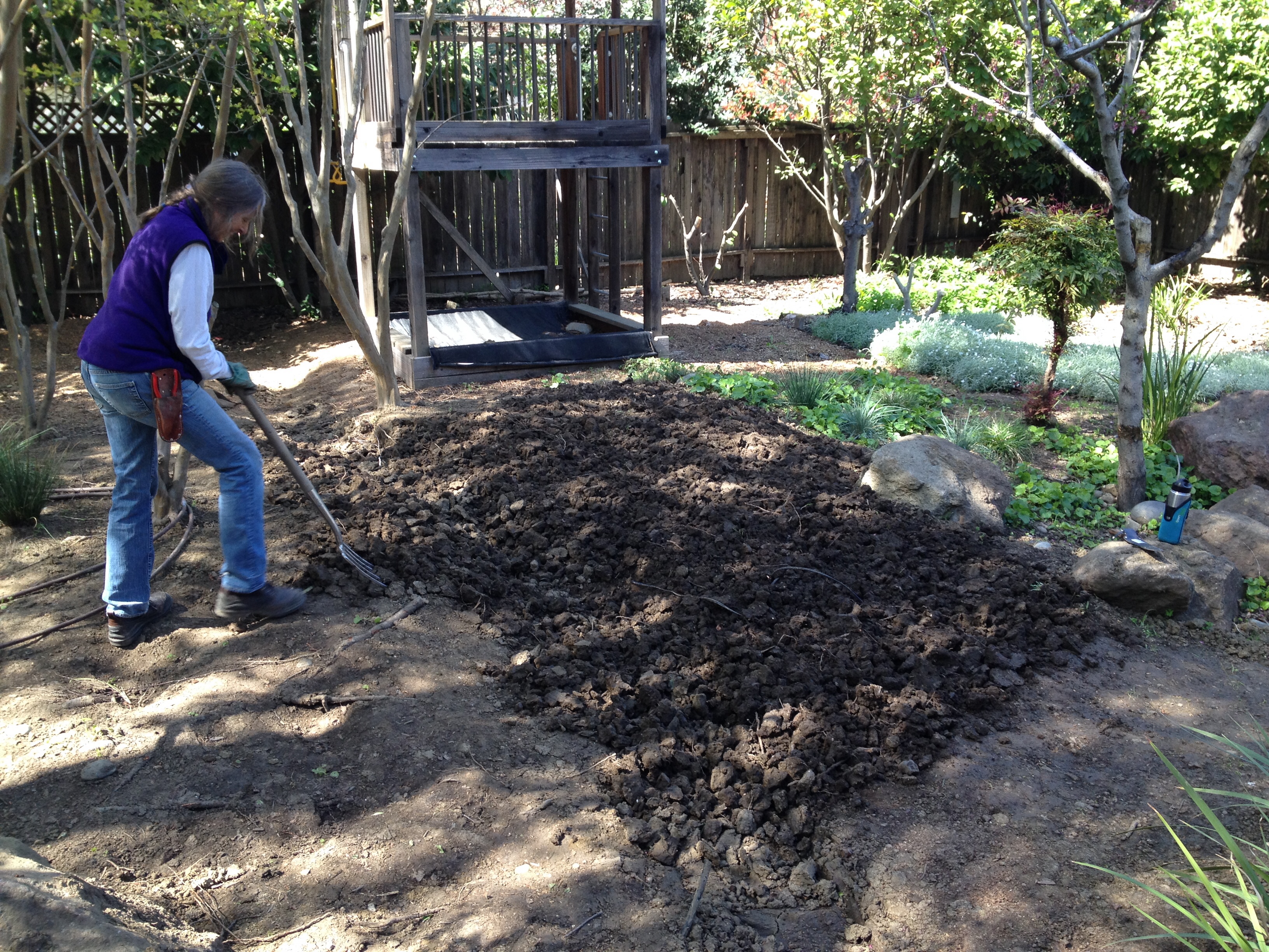 We got 3 yards of top soil to fill it in, a process made difficult by the rain which turned a lot of heavy dirt into heavier mud. But fill and spread we did: