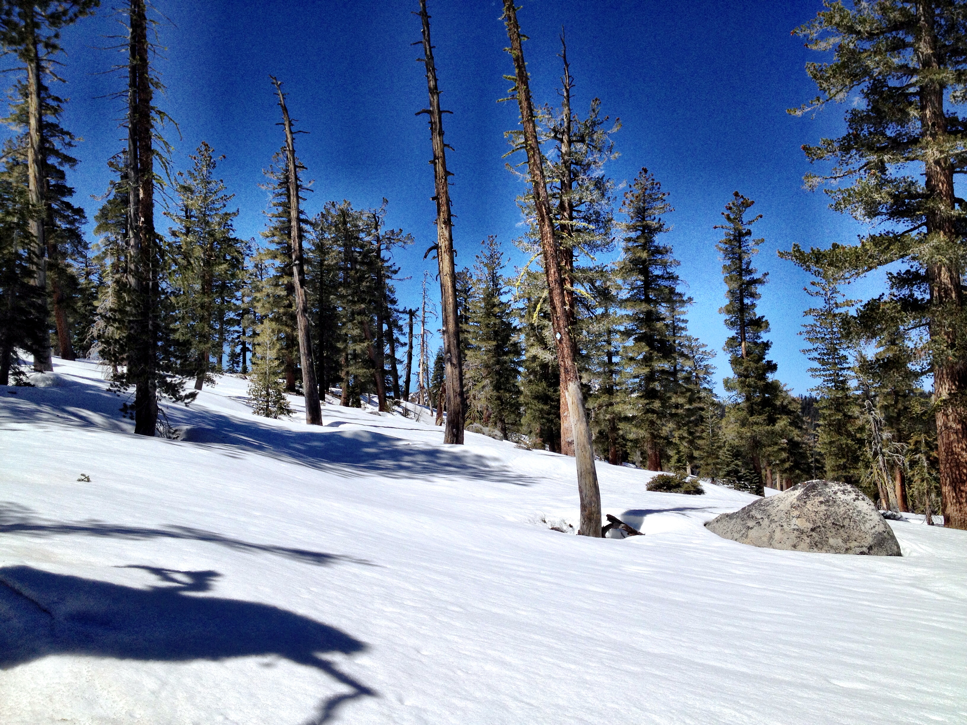 Then climbed up a great, sparkly slope (here’s a portion below) for a better view of the canyon through which Hwy 88 runs (though couldn’t see it.. too far below). This was a great hill to climb–good traction because the snow was soft and a great workout.