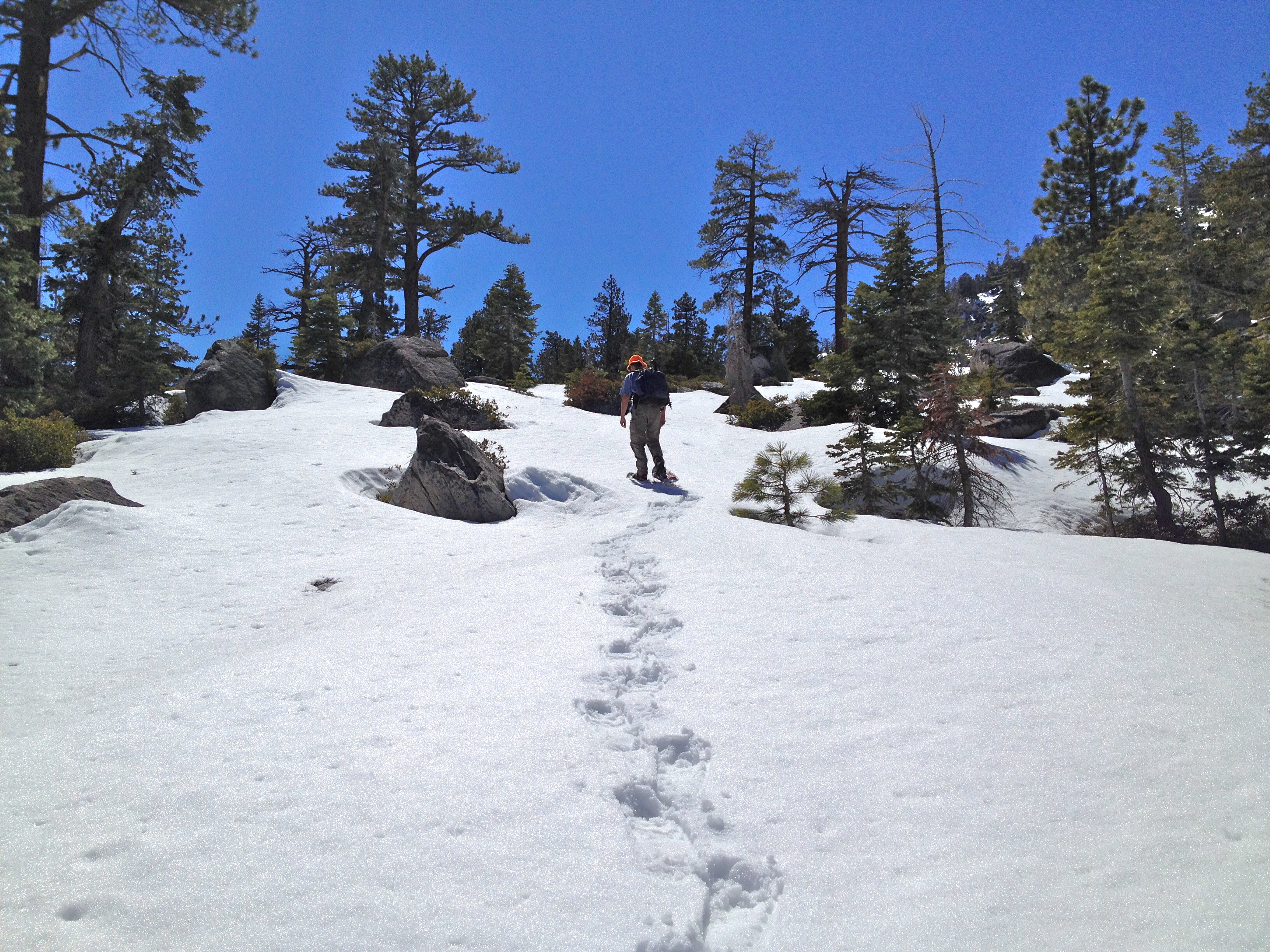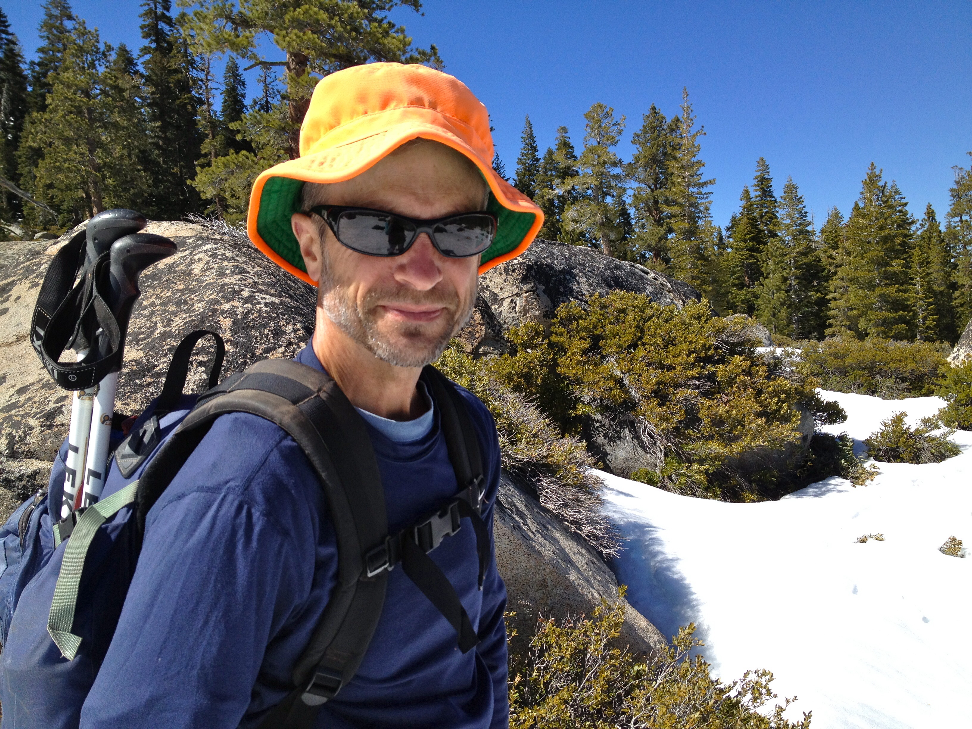 Warm enough for t-shirts. Jim took it all the way down to the first layer (sparing you this photo series); I was too lazy so hiked in a light thermal on top and left the heavy thermal on below (sweat therapy?).