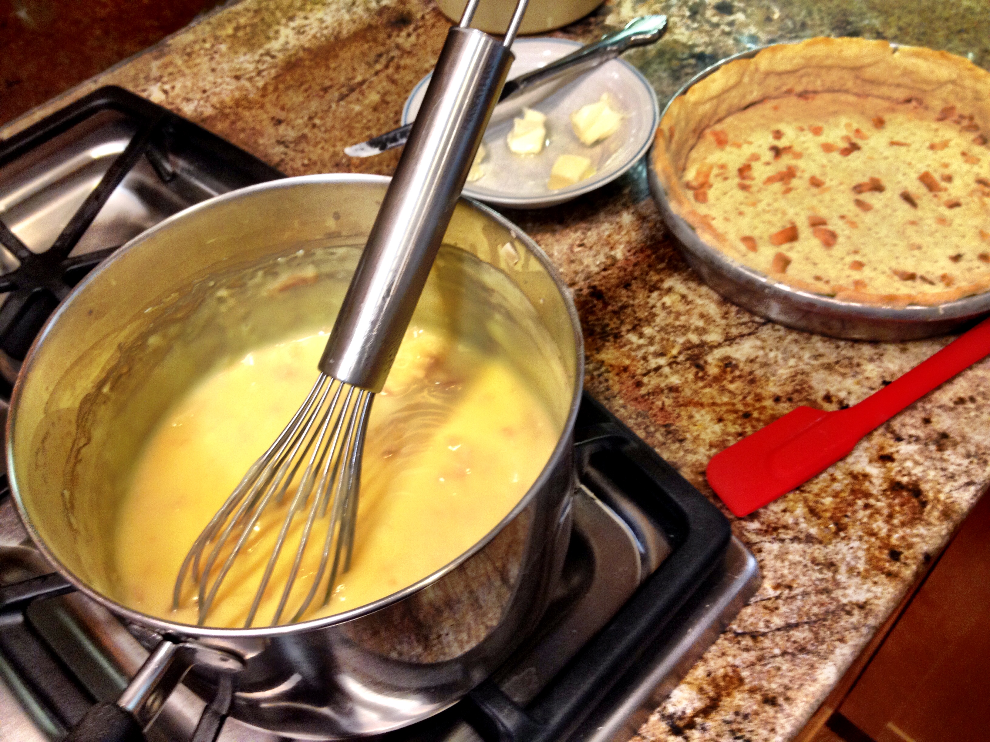 Here you can see the custard part (coconut milk, whole milk, sugar, egg yolks, cornstarch, coconut extract, butter, vanilla, and toasted coconut). And in the background you can see the crust… a basic crust with pieces of toasted coconut embedded. The top layer was whipped cream with added vanilla and I sprinkled over the very top more toasted coconut and shaved white chocolate. It turned out quite okay, if you like that sort of pie.