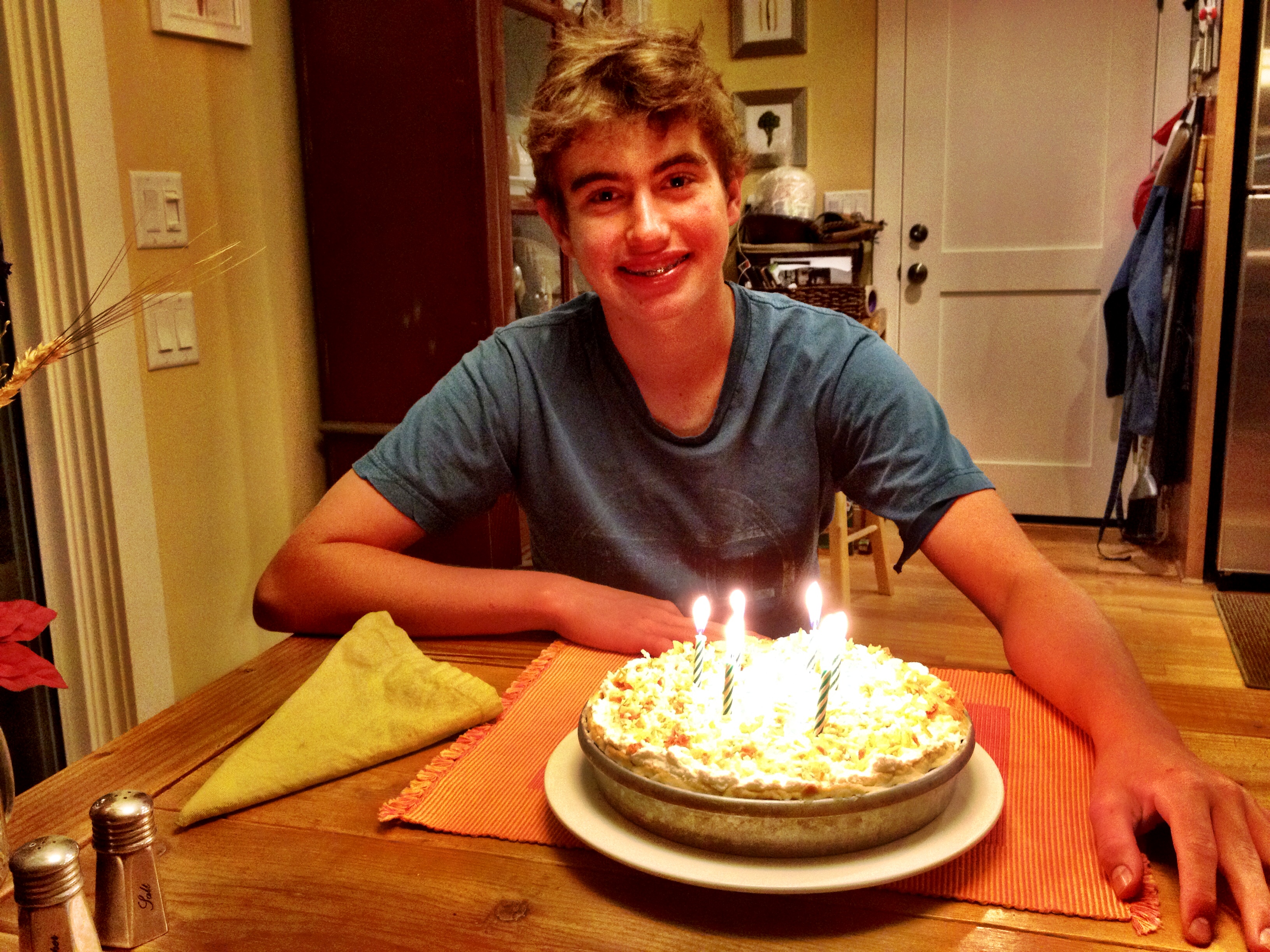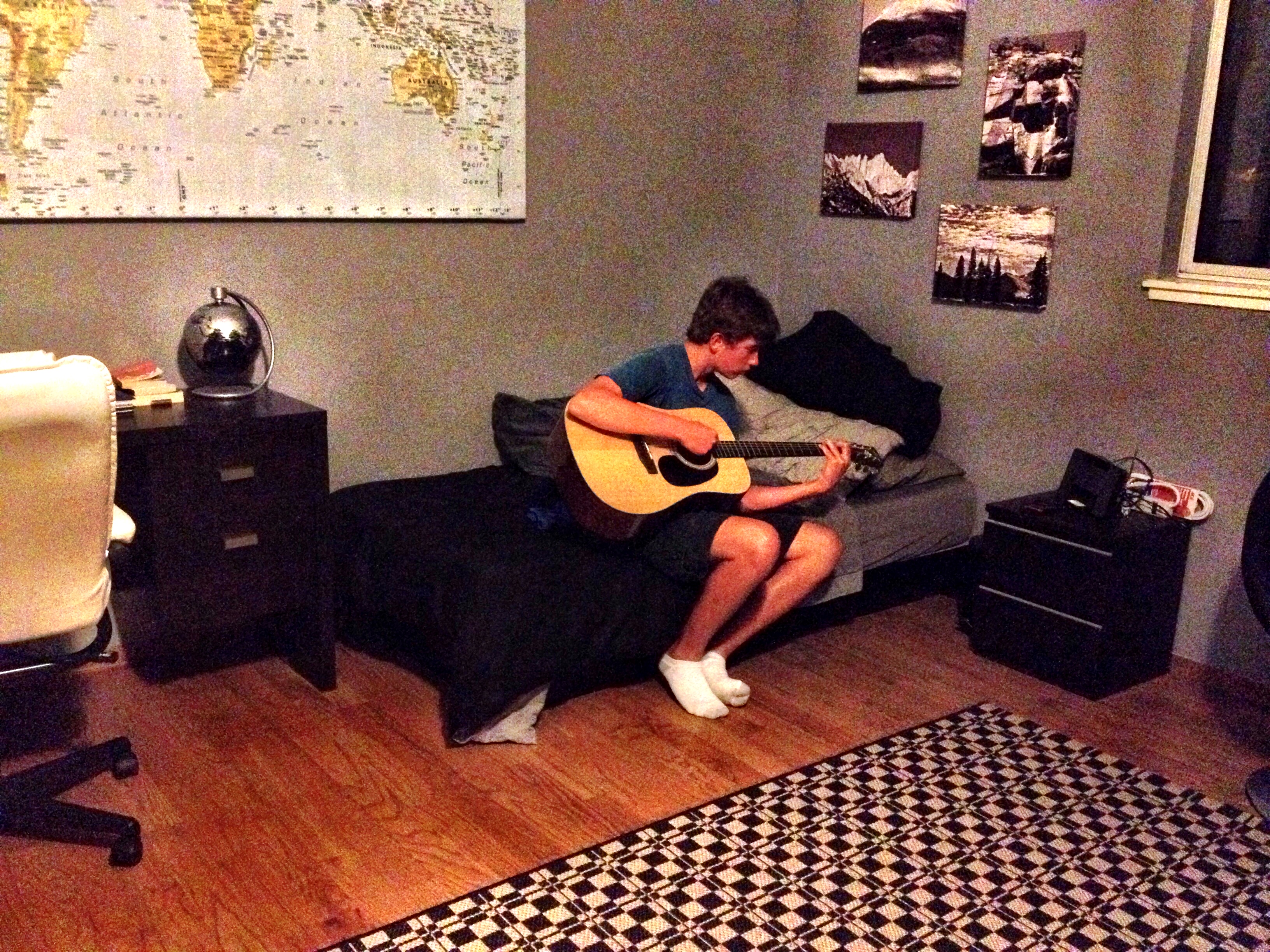 So, anyway, we each had a piece and then it was time for presents. Peter got birthday cards and birthday money from grandma, uncles, aunts, etc. From us, he got a t-shirt with a representation of the standard model something we learned about in that documentary about the Higgs Boson particle (Particle Fever) that we saw on Jim’s birthday and Peter loved; a planner (what organizationally-challenged high school junior doesn’t need one of those?); and mount that Jim made out of a branch from Peter’s sycamore tree (the tree we planted in our front yard when Peter was born and which was initially fertilized by Peter’s placenta.. uh, yeah). After he opened that, and politely said, “Cool,” Jim said, “Wait, did we forget one?” and looks at me, and I go, “Oh, yeah, there’s one other, I’ll go get it,” and I go away and come back with a big box that seems a lot more promising and Peter opens it and it has a guitar in it. Aren’t we just the funniest parents? So here’s that: