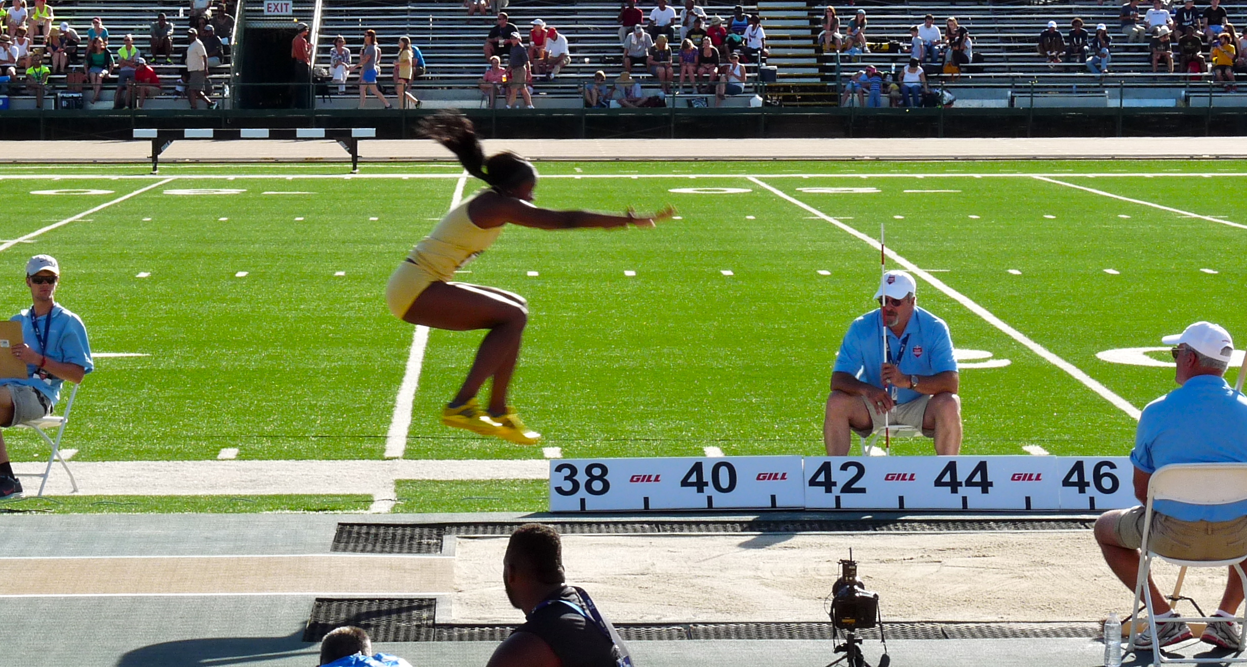 Then we (Madeline B and myself) left our spot at the finish line (great seats) and wandered across the field to watch the women triple jumpers. We found some empty seats in the jumping coach’s section, and realized we were sitting among coaches, teammates and friends of the jumpers, which made for a pretty intimate community around us… fun. Here one shot (of many) that I took. The best of the women were getting about 44-45 feet. Such an awkward event, but fascinating. Hat’s off to these guys!