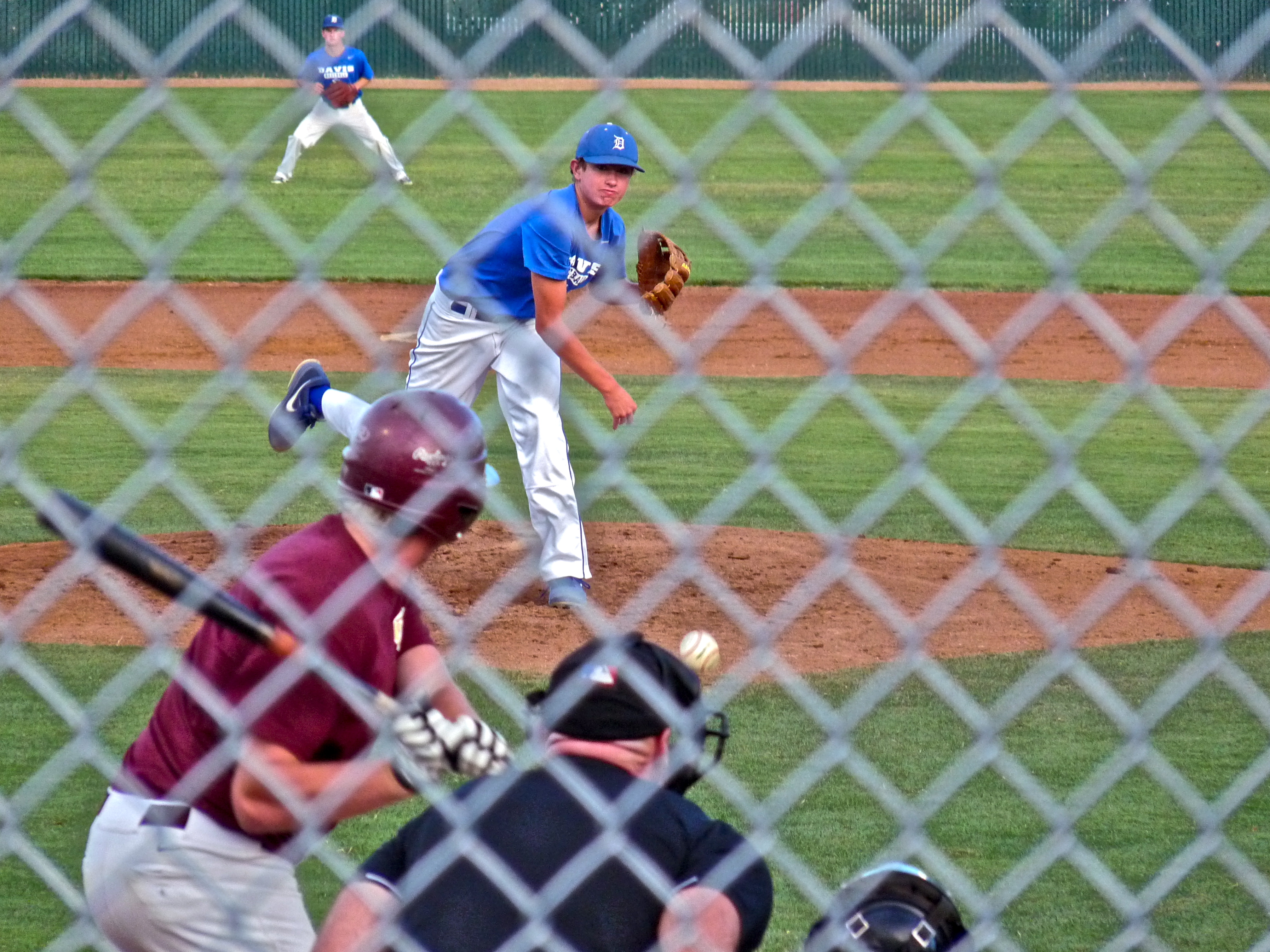 So tonight? The summer varsity squad played under the lights on a warm (though not nearly as warm as the night I described three years ago), windless evening, on a field as beautiful and lush as the one I described back then. Only this time, Peter wasn’t the bat boy, he was the pitcher. And while not the biggest guy on the field, he wasn’t the shrimpy guy he was back then, either.
