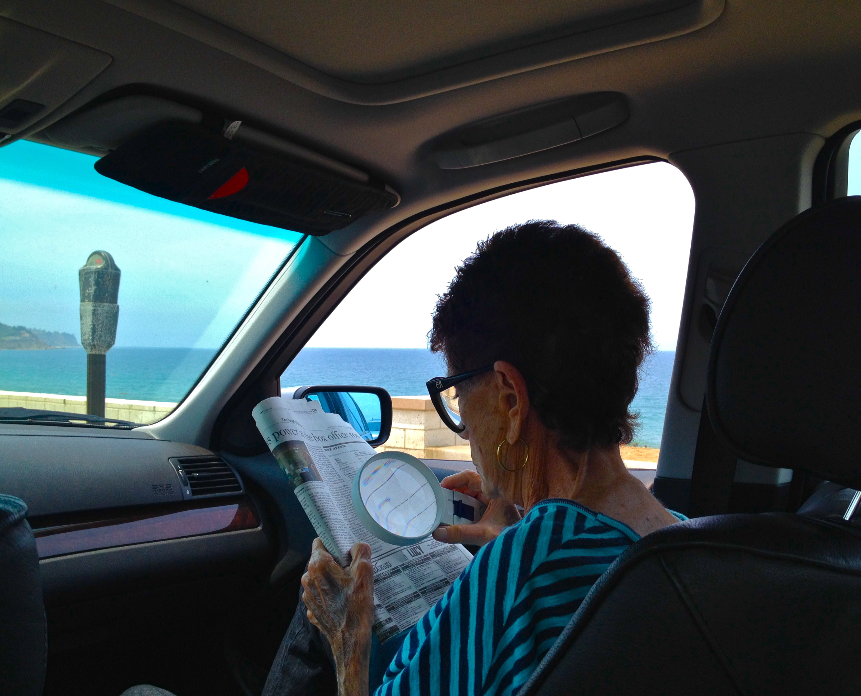 Read for almost two hours–mom her LA Times, me the manuscript I’m editing. Right here. In the car. Periodically looking up to look at the ocean and do a little people-walking-their-dog-watching. Mom in front, me in back. The windows were open, so we caught lots of conversation snippets, too.