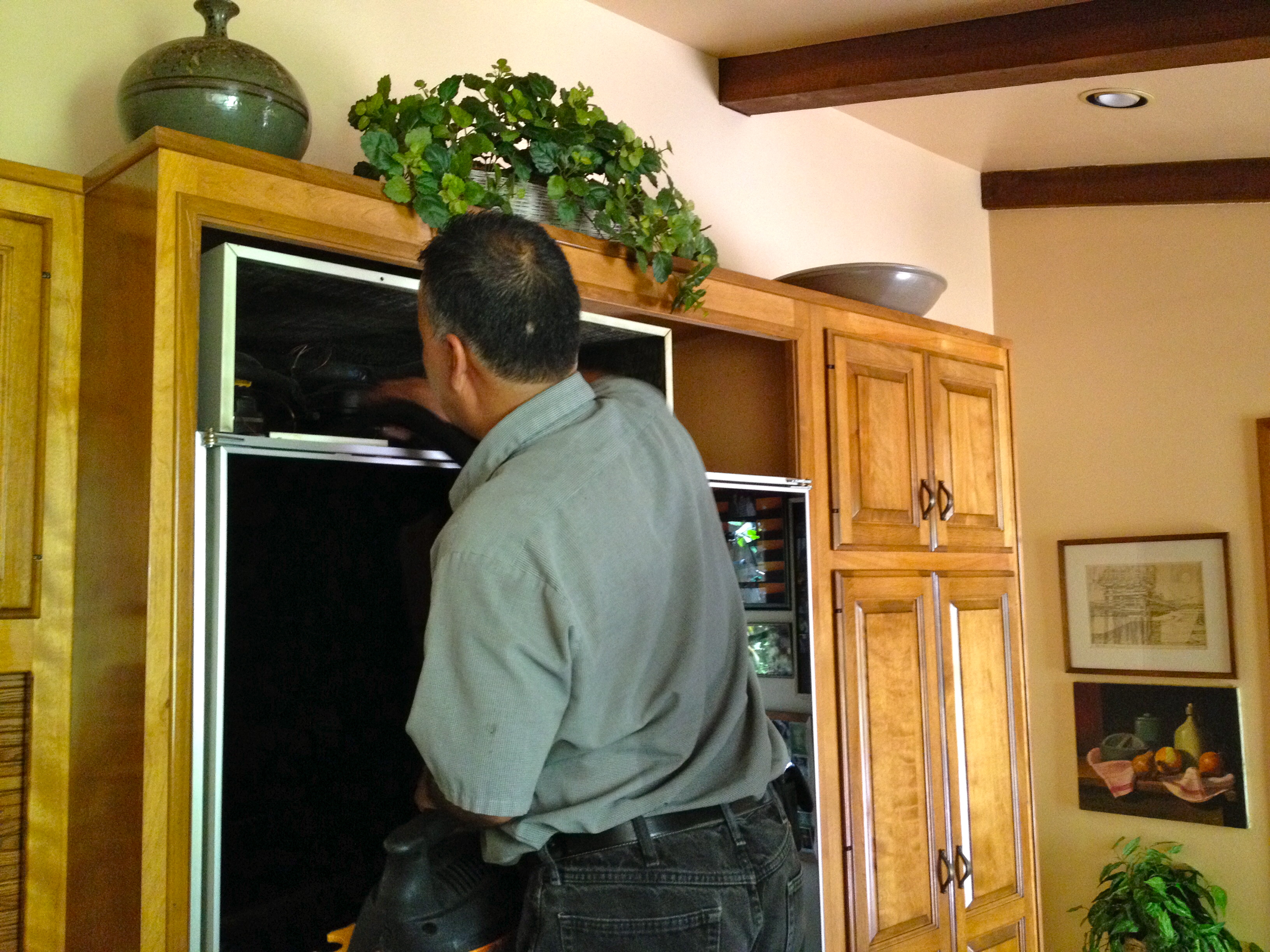 Long story short, Sergio, pictured here on a ladder with a vacuum in his hand, came over and, after a short investigation, announced we had severely clogged filters in the compressor compartment, which, if not thoroughly cleaned on a routine basis (annually is suggested), leads to all kinds of refrigerator inefficiencies, which leads to the one thing refrigerators are designed to prevent: spoiled food (which we now have a ton of).