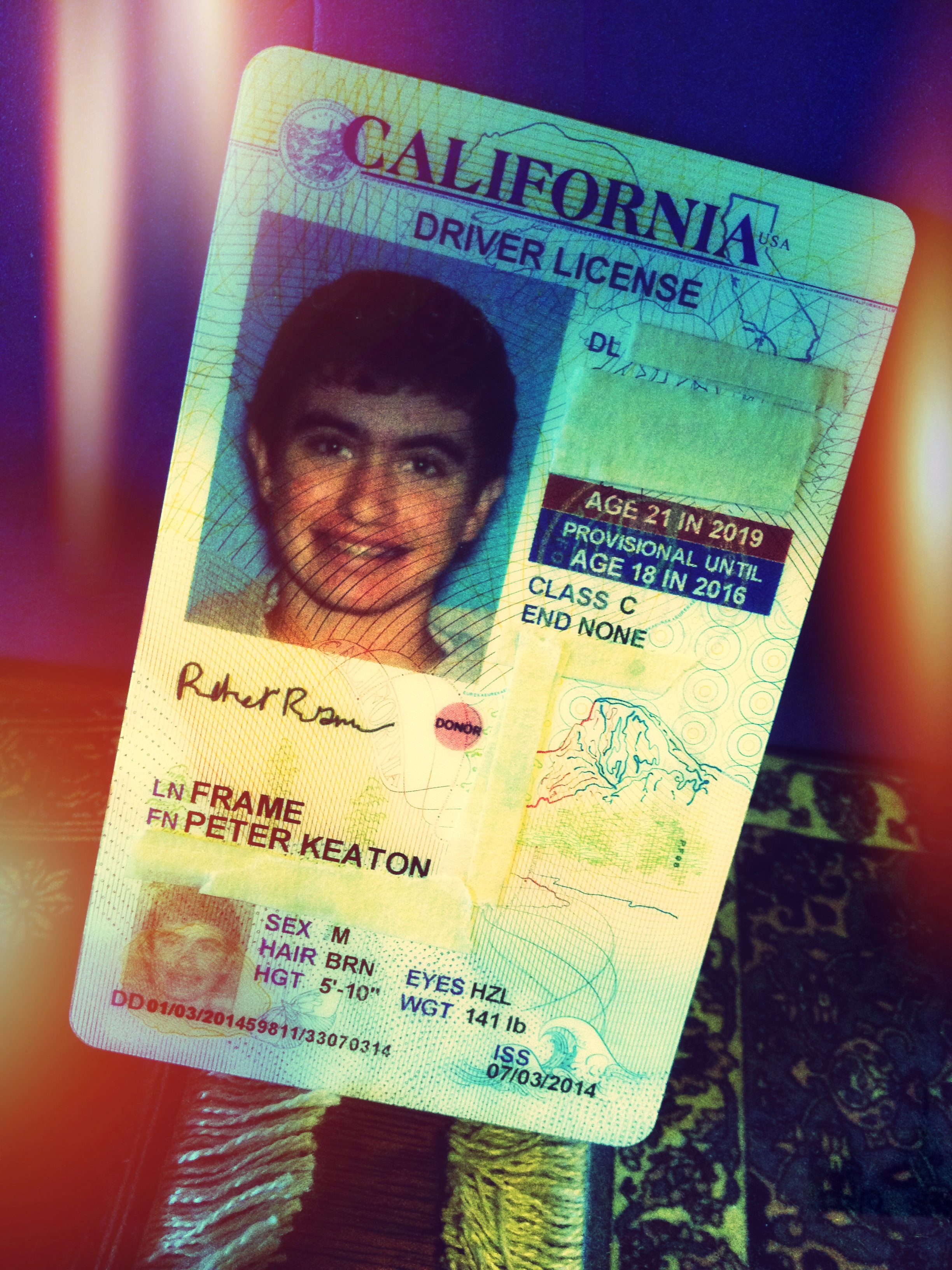 Couple things to know: ONE, this is a provisional license. His status as a driver is provisional until he’s eighteen, I think. And maybe that’s why his license is oriented vertically? I’d never seen that before. AND, TWO, because the boy’s never learned how to write in cursive, his signature is entirely his own interpretation of what it means to sign one’s name. Thus…