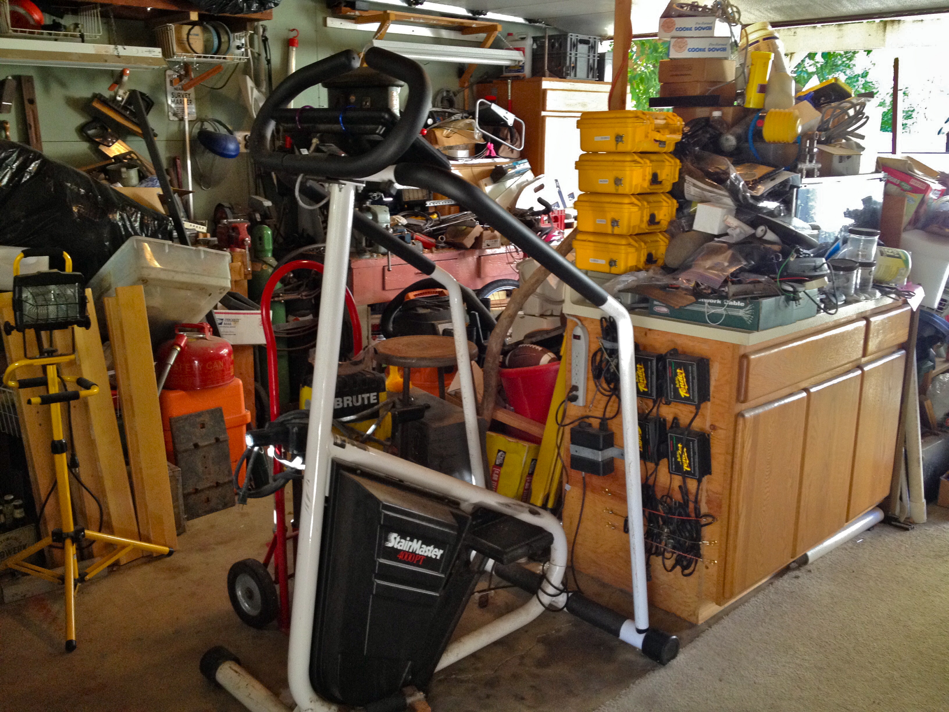 But, as I wrote a couple days ago, I’ve discovered, in the last six months or so, that time spent on Jim’s Stairmaster, which is in the garage, is well worth the clutter shock.