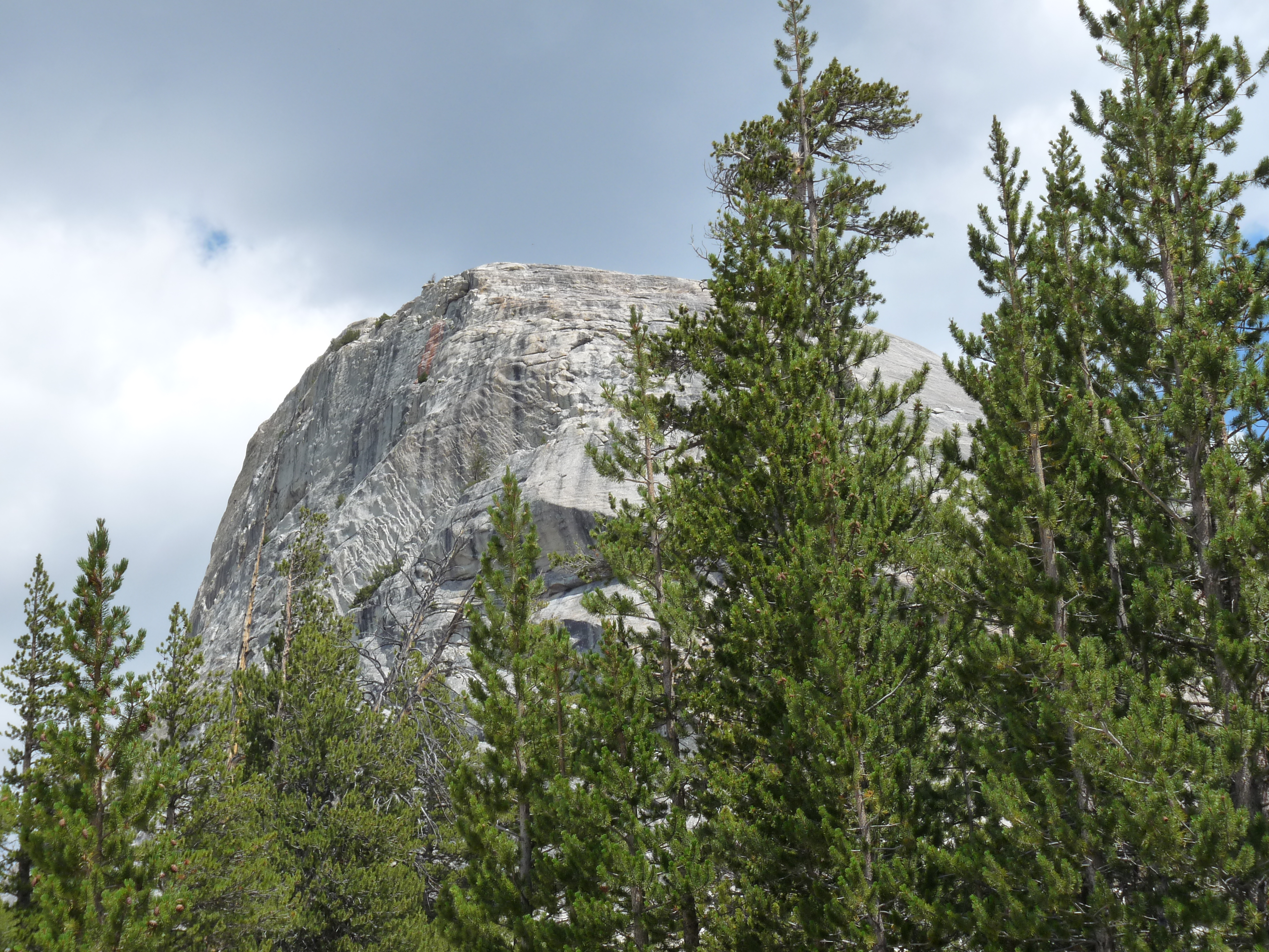 After about an hour or two up there, we descended, and decided to go down around the backside of the dome, getting to a different trailhead and parking lot. Along the way, Peter and I took a .3 mile detour to get a look at Dog Lake. Nobody was around and the lake was still. That’s Dana (13,061′ second highest peak in Yosemite), center.