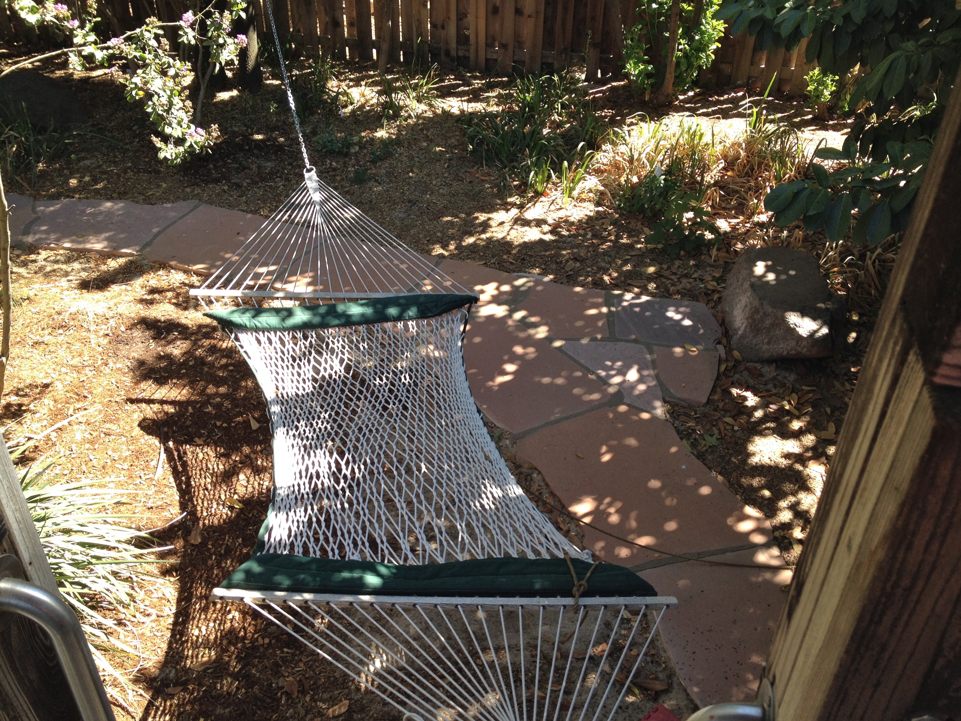 Looking down on the hammock. The hammock actually, presently, attaches to one of the posts… though it’s going to move because it also hangs right over the path.. we can’t have that!