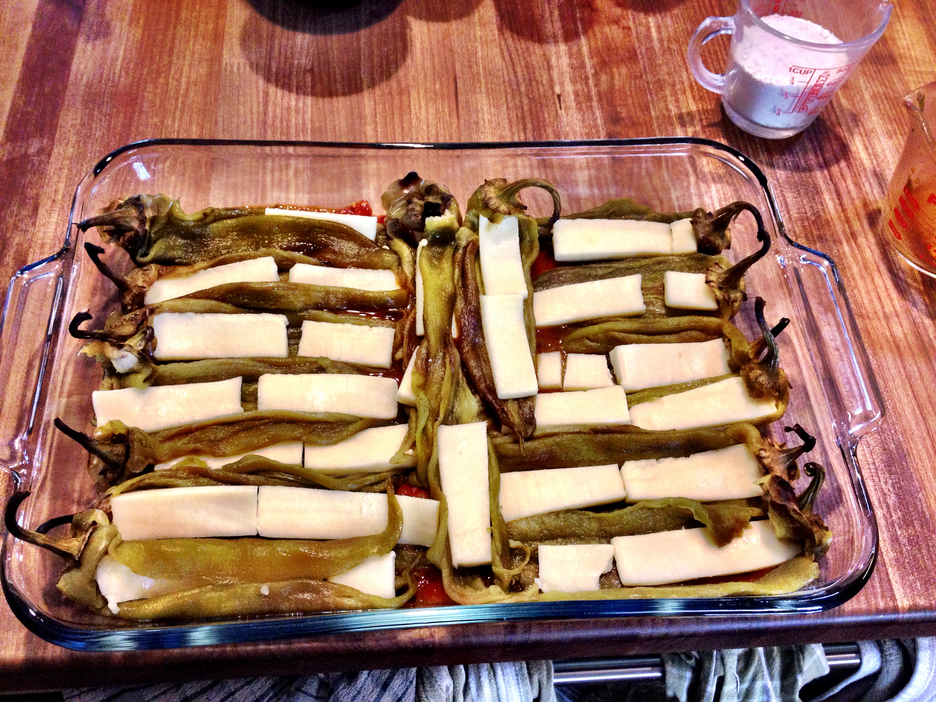 I then cut them open, deseeded them, filled them with jack cheese, and placed them in a dish on top of a thin layer of homemade tomato sauce.