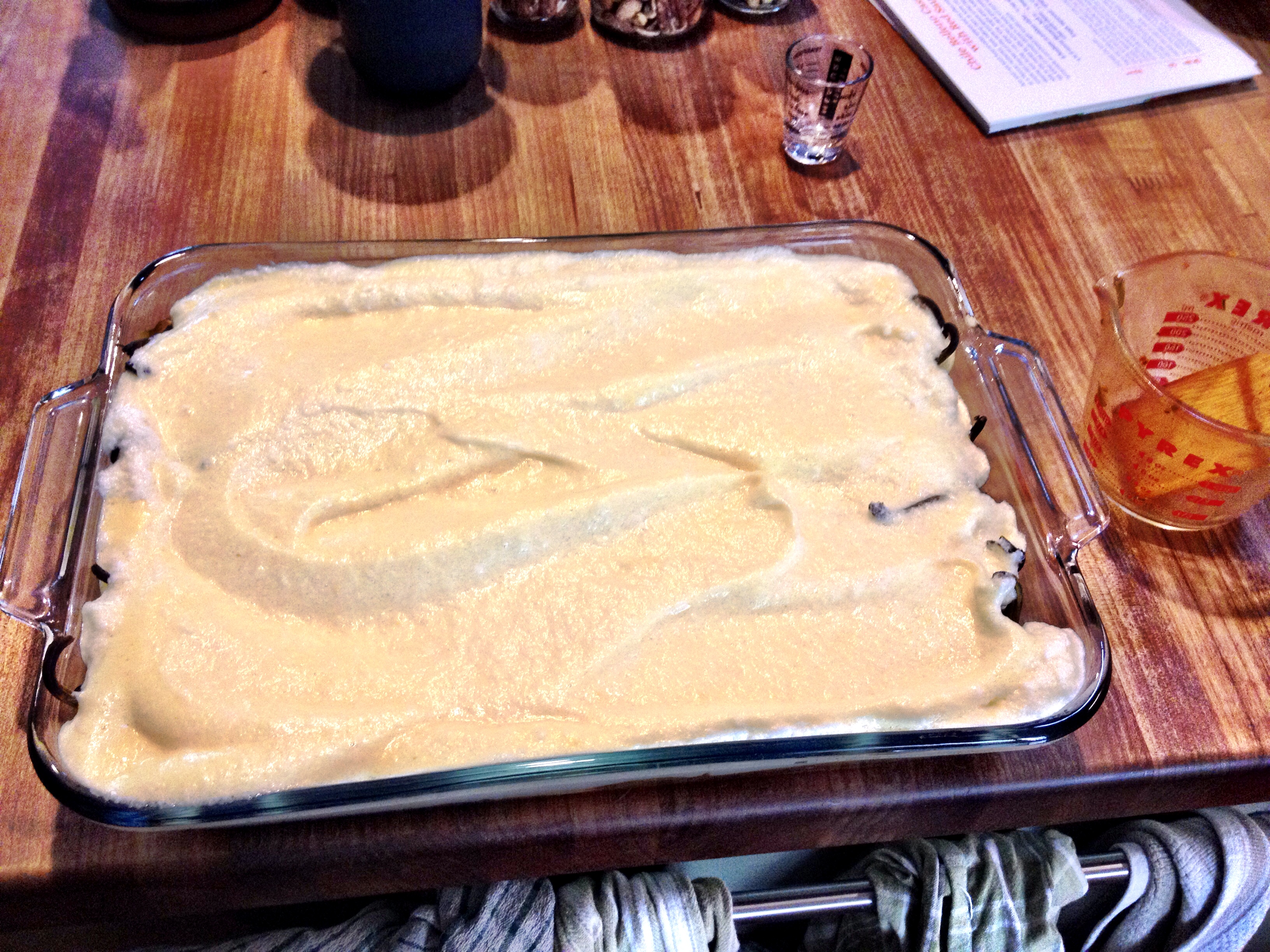 Then, I separated sixteen eggs, beat the yolks and whites separately, folded them together with flour and salt, and spread the whole mixture over the chiles, cheese and sauce. I’m never very confident with figuring out how long to go to get stiff peaks and I worried I’d gone too far because the texture of the raw mixture was weird…